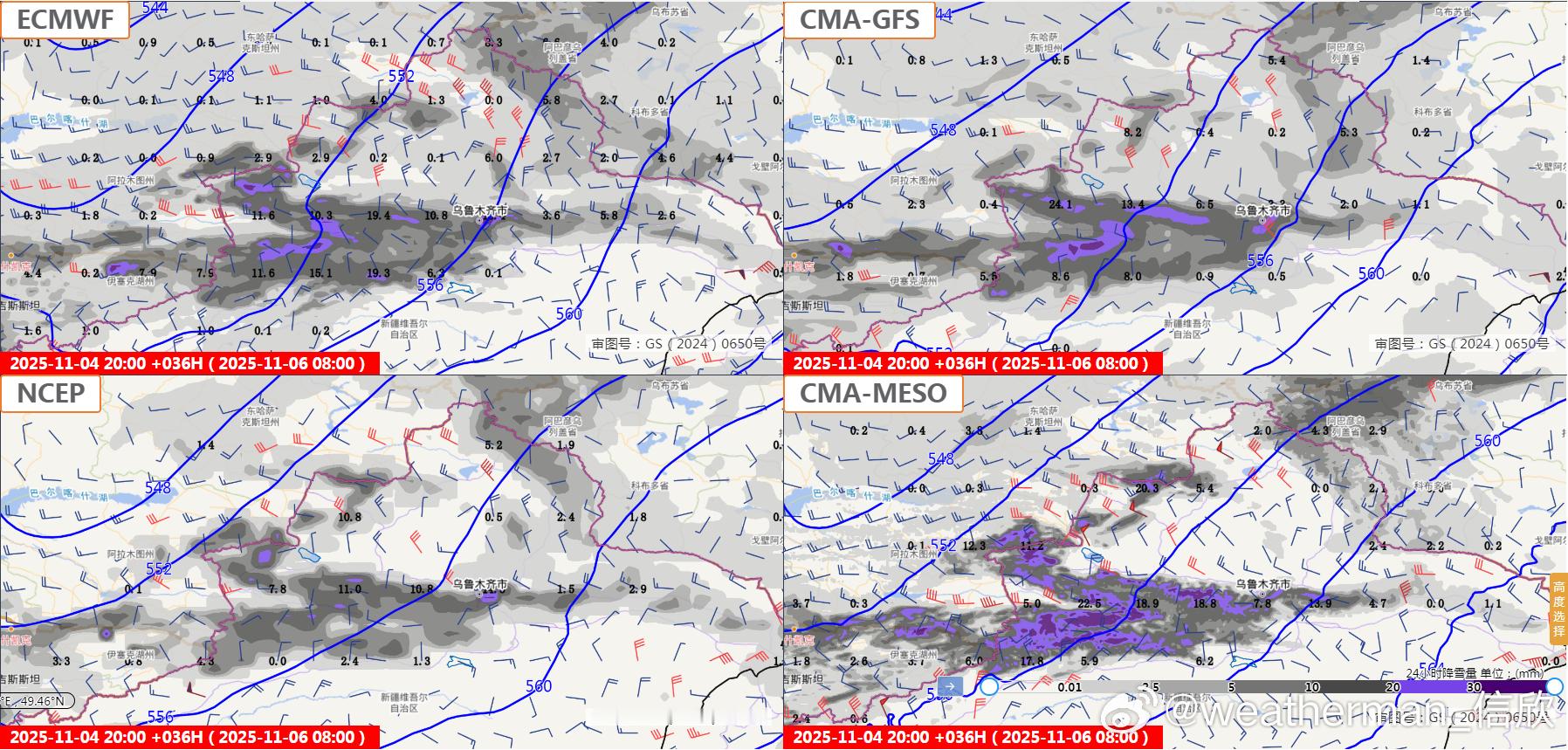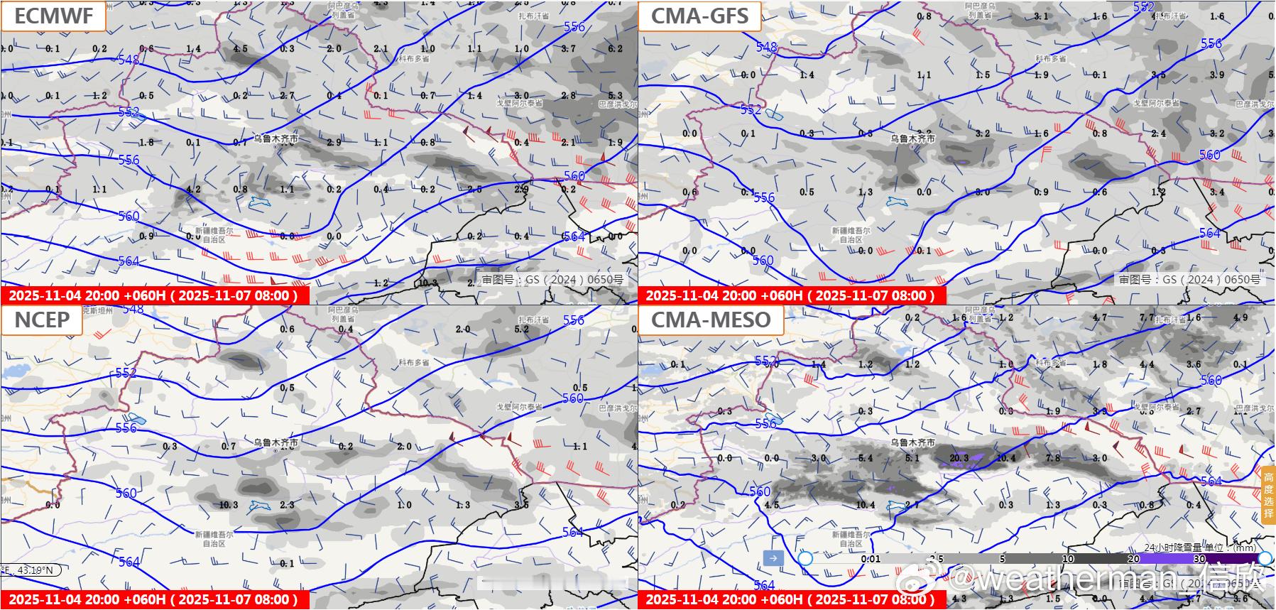 【雨雪】昨天到今晨,南方出现大范围降水,海南部分地区出现暴雨,总体降水强度在减弱。今天南方降水明显缩减,降水重点转移到新疆。今明两天新疆北部沿天山一带将出现强降雪,部分地区积雪可能超20厘米。此外6日在青海北部也可能出现明显降雪,6日夜间-7日晨,西宁有望迎来初雪,兰州也存在理论上初雪的可能。