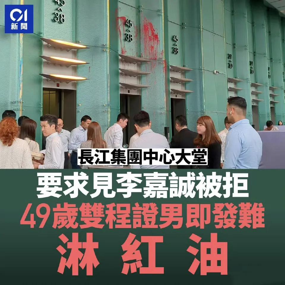 向公司泼红漆 一名男子因为求见李嘉诚被拒,居然在大堂里泼红漆、打伤保安,最后被警方当场逮捕!这出闹剧不仅让现场乱成一团,还让网友们纷纷吐槽:“这年头,追星追到要见李嘉诚,还动起手了?” 事情是这样的:49岁的陈姓男子从内地来港,11月4日上午带着三罐红漆冲进长江集团中心,直奔大堂接待处,开口就要见李嘉诚。保安当然不可能随便放人,尤其是李嘉诚的办公楼层根本不在大堂电梯能到的地方。 结果陈某被拒后,情绪瞬间失控,直接打开红漆罐,对着电梯门、地面和玻璃墙一顿狂泼!现场瞬间变成“红色灾难片”——地面湿漉漉全是红漆,电梯门上溅得像抽象画,连玻璃饰面都没能幸免。 更离谱的是,一名57岁的罗姓保安见状赶紧上前阻止,结果被陈某一拳打在脖子上,当场红肿受伤,疼得直捂脖子。其他保安同事一看情况不对,立刻报警。 警方和救护车火速赶到,把陈某按倒在地,手铐一铐直接带走。受伤的保安被送去医院,好在伤势不重,但这场面想想都让人后怕——要是陈某手里不是红漆而是别的危险物品,后果简直不敢想! 长江集团很快回应,说事件已交由警方处理,对保安受伤表示遗憾,会提供协助。有知情人士透露,这已经是陈某第三次来长江集团中心闹事了,之前两次也是各种滋扰,甚至有人觉得他“精神不太正常”。 不过警方还没证实这一点,但光是“三次闹事”就够让人无语了——见不到人就泼漆打人,这哪是求见,分明是撒泼! 说实话,看到这种新闻,我真是又气又无奈。李嘉诚是谁?95岁的商业传奇,香港首富,全球华人圈的标杆人物。想见他的人多了去了,但人家日理万机,哪能随便见? 就算真有商业问题要谈,也得走正规渠道吧?直接冲进大堂泼漆打人,这不是“求见”,是“耍流氓”!更别说还打伤无辜保安——人家只是尽职工作,凭什么遭这份罪? 而且这已经不是第一次有极端分子盯上李嘉诚了。2023年就有个27岁的内地男子,拿着铁锤砸长江集团中心的招牌,说要“商讨商业问题”;2015年还有个19岁的无业青年,半夜翻墙想进李嘉诚的豪宅,还自称是“亲孙子”……这些事听起来像笑话,但背后藏着的却是极端行为对公共安全的威胁。 李嘉诚的安保措施已经够严密了——豪宅围墙4米高,带高压电网,24小时有退役特种兵守着;出门坐防弹车,保镖跟了一串——但就算这样,还是有人想方设法闹事。这说明什么?说明有些人根本不把规则和他人安全当回事,只想着自己“要个说法”“见个面”,甚至用暴力达到目的。 更让人无语的是,这种极端行为一旦开了头,很容易被模仿。今天有人泼漆,明天会不会有人带更危险的东西?今天针对的是李嘉诚,明天会不会是其他公众人物?公共场所的安全不是小事,保安的命也不是草芥——他们也是父母的孩子、孩子的父母,凭什么要为别人的疯狂买单? 所以我真心想对那些“执念太深”的人说:追星也好,求见名人也罢,都得守住底线!有问题走法律渠道,有诉求找正规途径,别把自己的疯狂建立在别人的痛苦上。 否则最后买单的只能是你自己——就像陈某,现在等着他的不是李嘉诚的会面,而是警方的起诉书和法律的制裁。 你觉得这种极端求见行为该怎么管?是加强安保,还是得从法律上严惩?评论区聊聊你的看法吧。