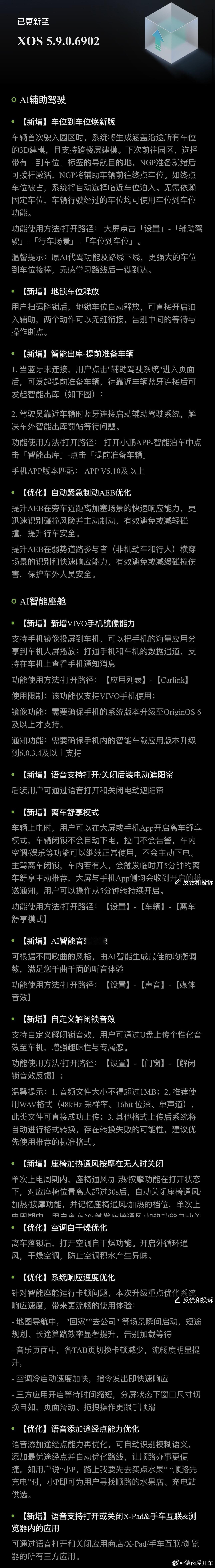 小鹏天玑 XOS 5.9.0 开启内测,系统新增「车位到车位焕新版」。新能源汽车