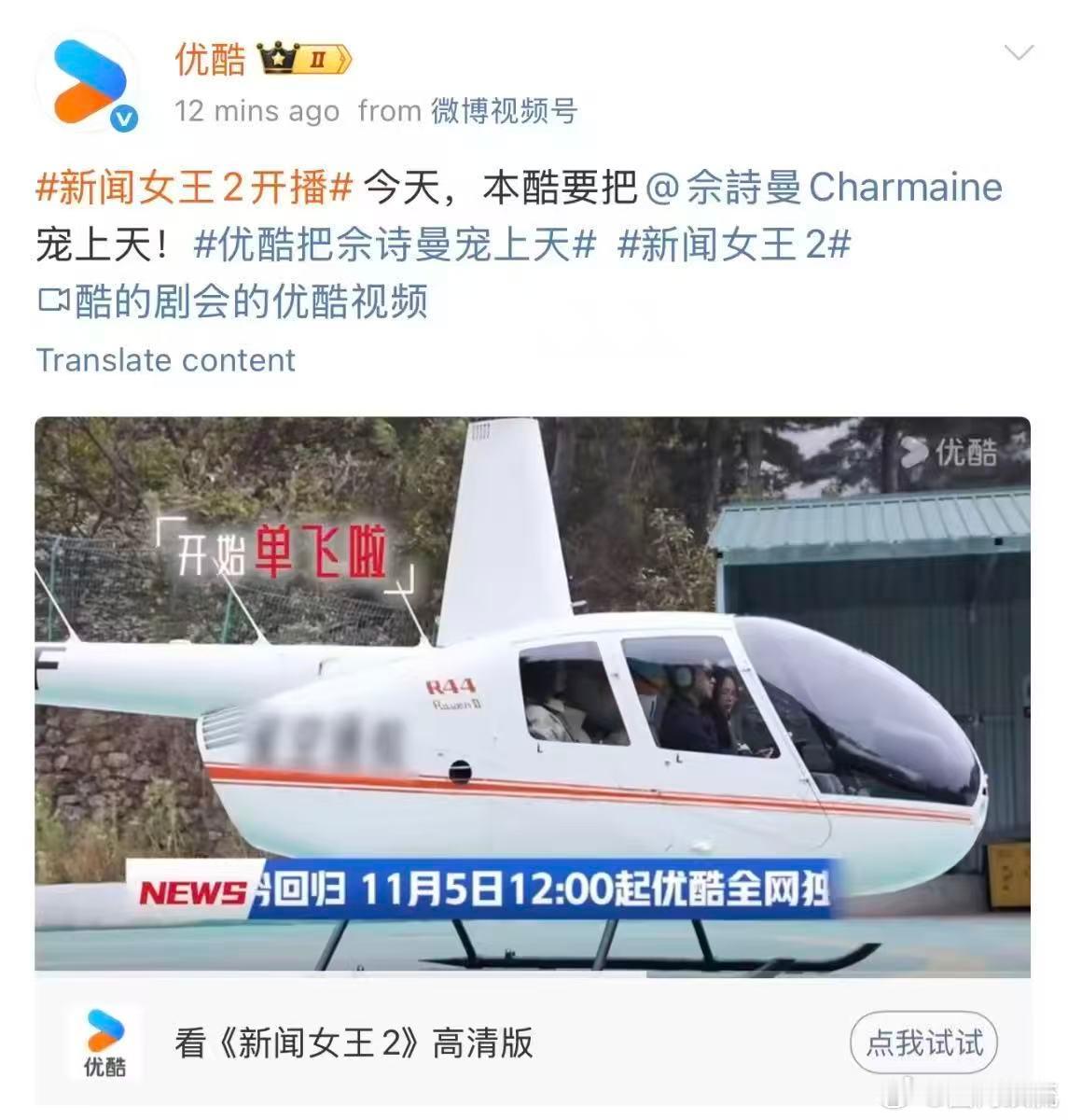 优酷把佘诗曼宠上天 谁懂啊👖给佘诗曼的应援排面拉满了!直升机专程送Man姐回归,姐姐戏里戏外拿的都是女王剧本,今天新闻女王2就要播出啦,狠狠期待今天文慧心返场了!🥺新闻女王2