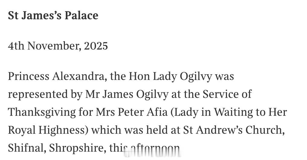 【公务日志】2025年11月4日,奥格尔维夫人亚历山德拉公主委托她的儿子James Ogilvy出席她的女官的追悼会✍🏻这个不纳入她的公务哈,她已经基本处于退休状态。