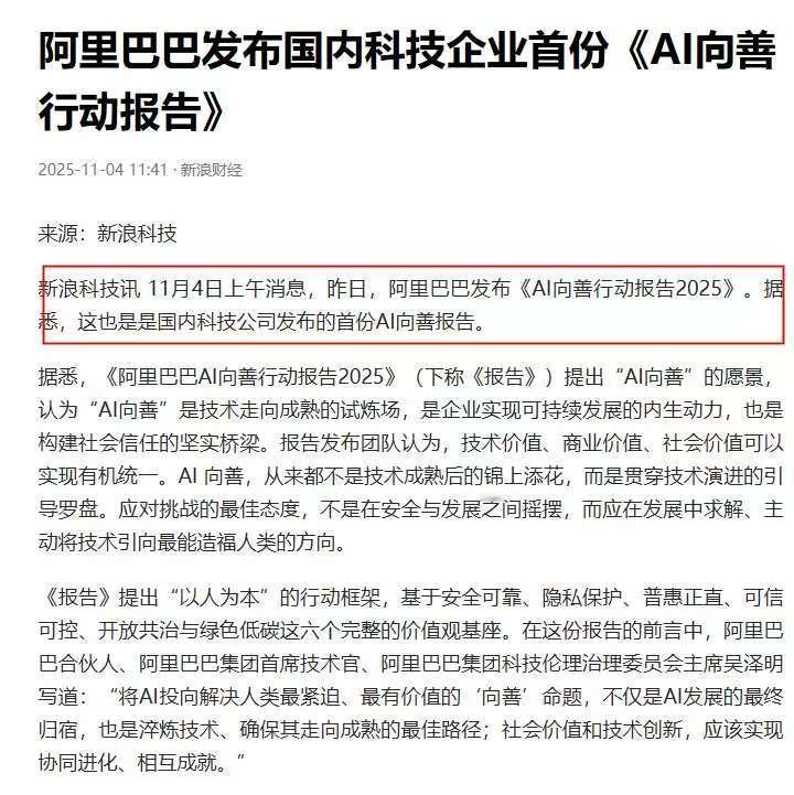 要不是这份报告出炉,很多人都差点被蒙在鼓里,原来阿里一直在“偷偷”做好事! 刚刚看到这么一个消息,阿里巴巴发布了《AI向善行动报告2025》,这也是国内科技公司发布的首份AI向善报告。 在报告中,阿里认为“AI向善”是技术走向成熟的一个试炼场,也是企业实现可持续发展的动力。 这话简单理解就是,AI技术在当下的影响力很大,能量更是惊人,可以做非常多的事情,而在这过程中,咱们必须要从“向善”出发,将技术用在做好事,利于社会当中。 值得注意的是,技术向善不是阿里在AI时代的突然转型,而是长久的坚持,因为技术,这些好事正在我们身边发生。 例如很多人都听说过得“团圆系统”,是咱们国内的打拐神器,上线9年时间就找回了五千多个失踪儿童。而这团圆系统背后,提供技术支持,进行研发的就是阿里。 还有几年前高德推出的轮椅导航,同样是一个证明,通过技术手段,已经为用户提供了超过1.5亿次的无障碍出行路线规划,让每一个乘坐轮椅出行的用户,都能够放心出行。 而进入到AI时代,阿里这份初心也没有变过,一直在坚持AI向善。 阿里达摩院医疗AI就是一个很好的例子,它推出的多癌AI早筛技术,就可以实现让患者通过一次CT平扫就能筛查包括胰腺癌在内的13个病种,不但提升了检出率,而且还降低了患者就医的经济压力。让更多的患者能够获得生的机会。 不得不说,要不是这次阿里的这份报告,很多人差点真的忘了,阿里在技术这条道路上,不只是在坚持创新,更是一直在坚持向善,不止是当下的AI,以前同样如此,这似乎已经成了刻在阿里骨子里的东西。 阿里巴巴集团首席技术官吴泽明说:“将AI投向解决人类最紧迫、最有价值的“向善”命题,不仅是AI发展的最终归宿,更是确保技术走向成熟的最佳路径。” 如今想想,阿里的技术能够越来越强,越来越成熟,始终站在世界前列,或许正是因为它一直坚持向善,在这过程中,让技术一次次的升华!