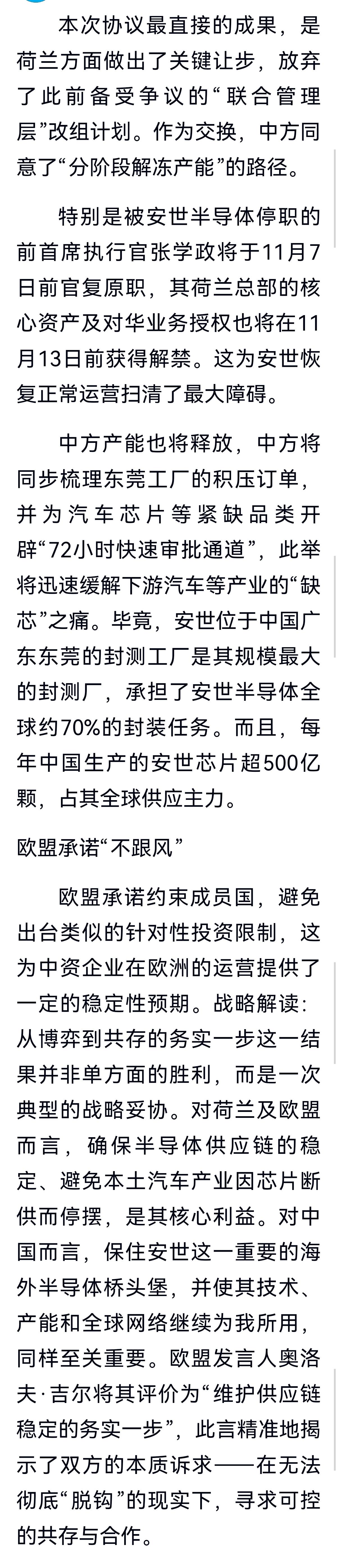 荷兰安世半导体迎来重大反转! 荷兰放弃干预安世半导体运营管理的掠夺方案。 中方原高管张学政 11月 7日前官复原职。 荷兰政府解禁荷兰安世半导体核心资产。 欧盟承诺“不跟风”,约束成员国,不再针对中国企业。 安世半导体此次事件给我们的教训深刻,我们要尽快亡羊补牢,防备后患。 也给其它中国企业提了个醒,境外投资须谨慎。安世半导体公司 荷兰安世半导体