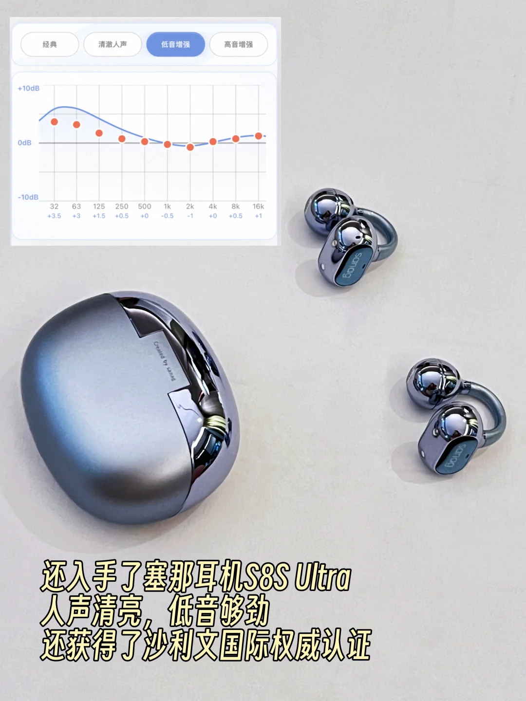 另一款是塞那S8S Ultra,作为每天通勤接近1小时的打工人,它直接解决了我的戴耳机痛点!耳夹设计戴久了不疼不压耳,戴眼镜也不冲突,跑步时还稳得很~音质更是惊喜,人声清亮、低音够劲,比之前买的耳夹耳机听感舒服太多。