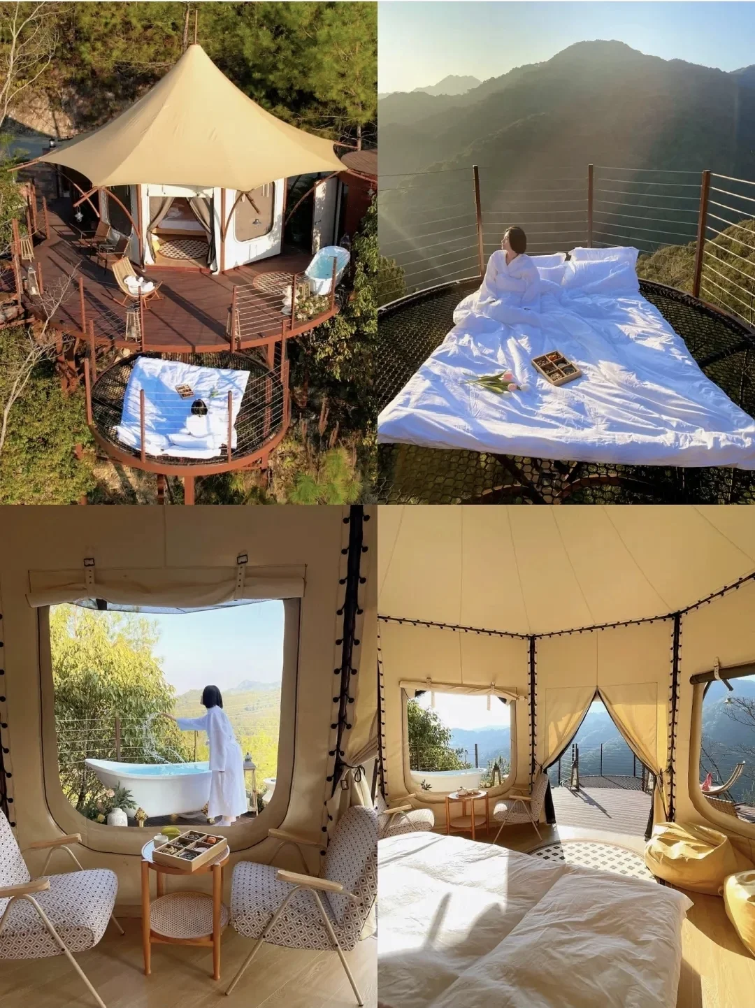 就在🌲图4️⃣(树洞travel)🌲688元=住悬崖帐篷+双人早餐+玩乐通票,全包含