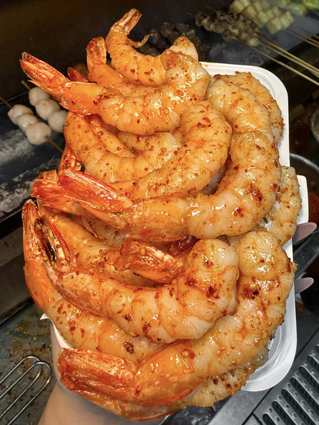 开到凌晨三点一直n刷! 超大个儿的麻辣烤虾🍤,Q弹入味 炭火烤嘎嘎香!猪脆骨、大油边…牙签鱿鱼香香脆脆,好吃到嗦手指!还有黏黏糊糊的东北麻辣烫和炒冷面