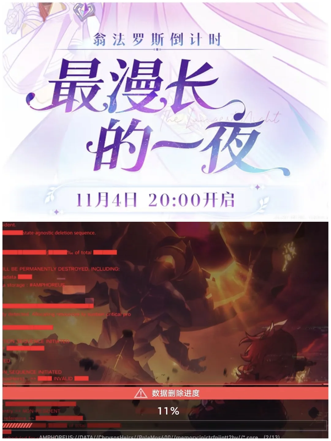 没想到在翁法罗斯的最终版本前夕, 崩铁官方开启了以「最漫长的一夜」为题的慢直播…… 起初大家都以为这是一场听听音乐,回味翁法罗斯之旅的温馨活动,没想到是「铁墓」病毒入侵三次元[扶墙R] 已知的三次元联动整活有: 1,改角色pv名字 2,MYS任意帖子输入角色名字可以触发彩蛋 3,《黄金史诗》删除中 目前阿格莱雅女士已惨遭迫害,缇宝进行中……