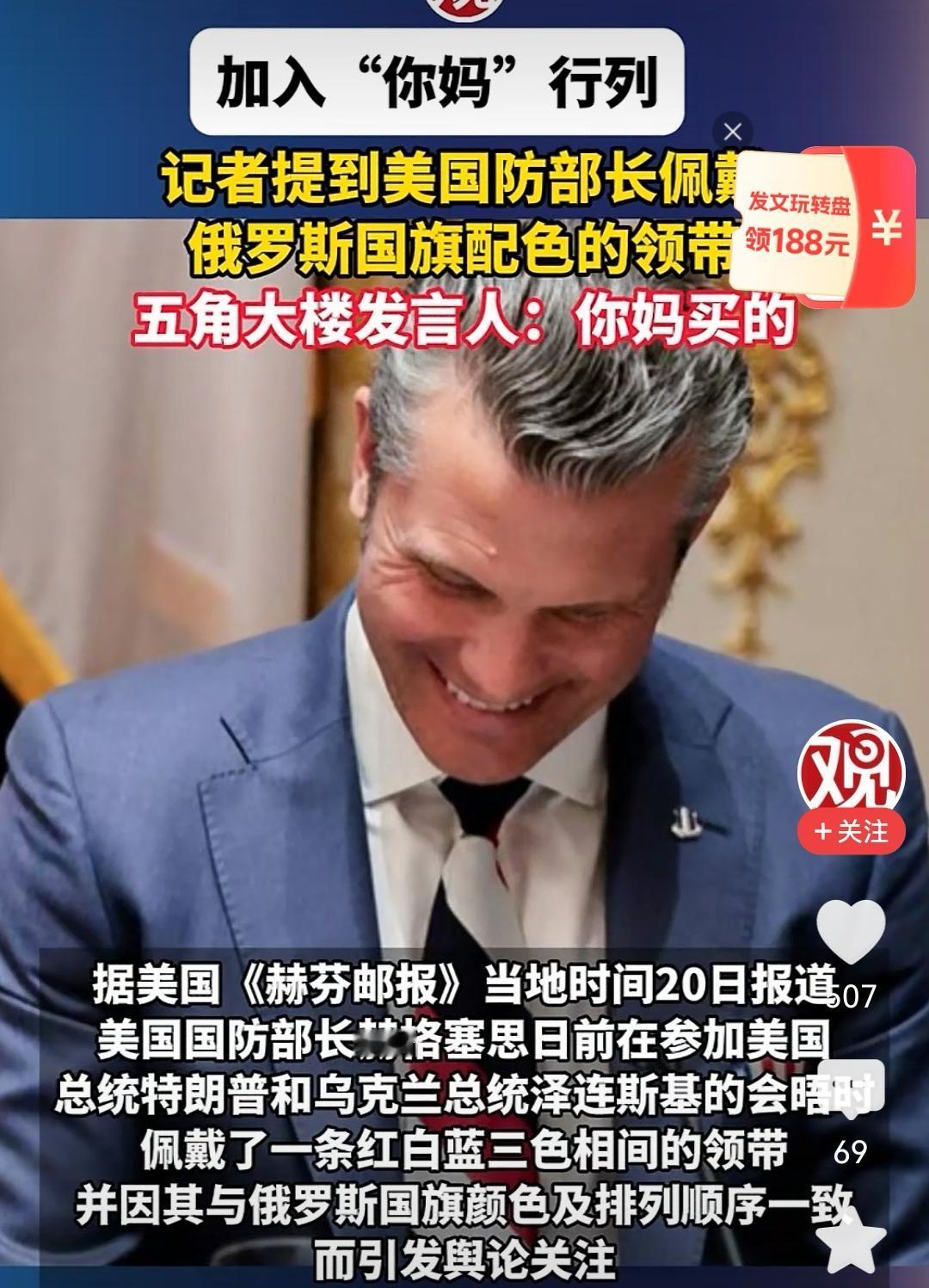美政坛言语“崩盘” “你妈定的!” “你妈给买的!” 无论如何你都不会想象得到,在中国人听起来感到亲切而又舒坦的回答,竟然从美国高级政要口里说出来就变了味,大有“狗嘴里吐不出象牙”的不悦。情不自禁的想起电影《让子弹飞》里师爷八岁私生子被从床底下被揪出来,气急败坏的高喊“你妈,你妈……”对抗的画面。 故事还要从两次美国政要答记者问讲起。特朗普和泽连斯基会晤闹剧结束后,美国《赫菲顿邮报》记者询问白宫新闻秘书,“普京和特朗普下一步会晤的地点为何定在布达佩斯”,这位白宫女秘书沉默几分钟后,抬起头突然暴口“你妈定的!” 记者顿时不知所措,也不知如何反击,全场人都在猜测“这个你妈是谁?”难不成这名记者的“妈咪”有这个权力解决两国元首见面的事。 又是一场记者见面会,还是这家报社记者问美国五角大楼首席发言人,“特朗普和泽连斯基会晤时,国防部长佩戴的红白蓝三色领带与俄罗斯国旗颜色和排列顺序一致,为什么?”,遭到了类似同样的回答“你妈给他买的!” 太神奇了!在极短的时间里这家报社当了两次家,做了两次妈,并且都是在级别很高的贵族口中喊出来的,比走上“星光大道”都过瘾,难不成报社有通天的本领。当然,事情并没有像美国两位高官“过嘴瘾”随便说说那样简单,也并不是这家报社真正是美国政府的幕僚政客,真正扮演了“他妈”的角色。 可能是美国政要头脑反应慢,也可能是无法正面回答这类问题,所以就灵机“回敬了他妈”。事实上,从两次的“他妈”事件中,暴露出了美国政坛与报社媒体之间的隔阂。这两个不同的组织,有着追求真理与掩盖真相的对立敌意。所以,当这位记者被闷头打了一棒,反应过来后追问,你是否感到这样回答很有趣时,五角大楼发言人更加歹毒的回答,“你居然真把自己当个记者了,真有意思,别再给我发你那些虚伪、有偏见的狗屁问题了。”体现了愤慨和嚣张跋扈,就差动手了。 在美国这个言论自由的国度,报社记者拿着政府的补贴,不但不为政府办事,还想尽一切办法挖“真理”,探“花边”,把“端碗吃饭,放碗骂娘”的道理演绎的淋漓尽致,不可能不被政要所记恨。所以当美国发生大规模游行时,特朗普亲自制作的开战斗机向市民扔“便便”的AI视频,第一个被浇的就是一家报社记者。 不管“你妈”也罢,“他妈”也罢!要告诉美国人口中的“他妈”这个词,或许在美国成了骂人的话,但在中国不是骂人的,也不希望看到更多的“他妈”在美国上演!