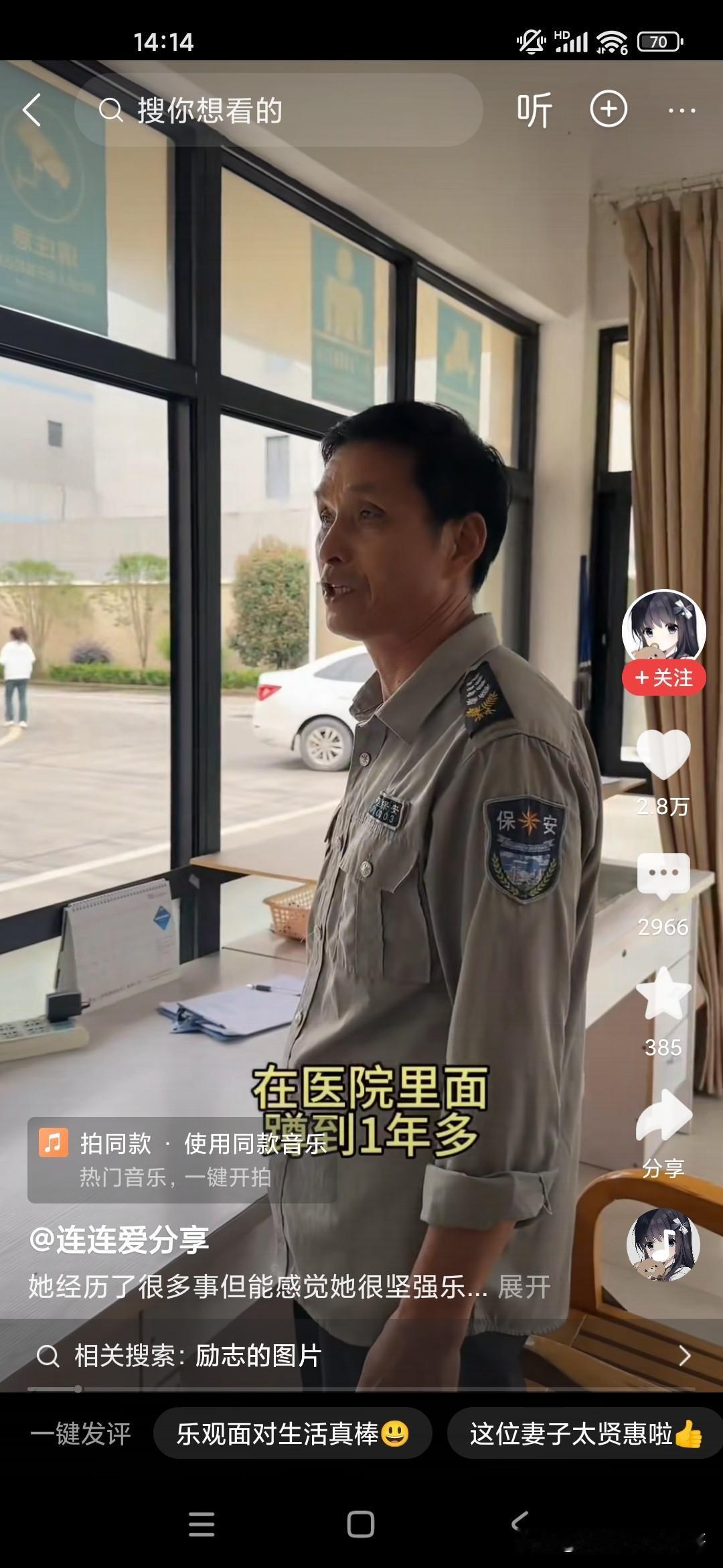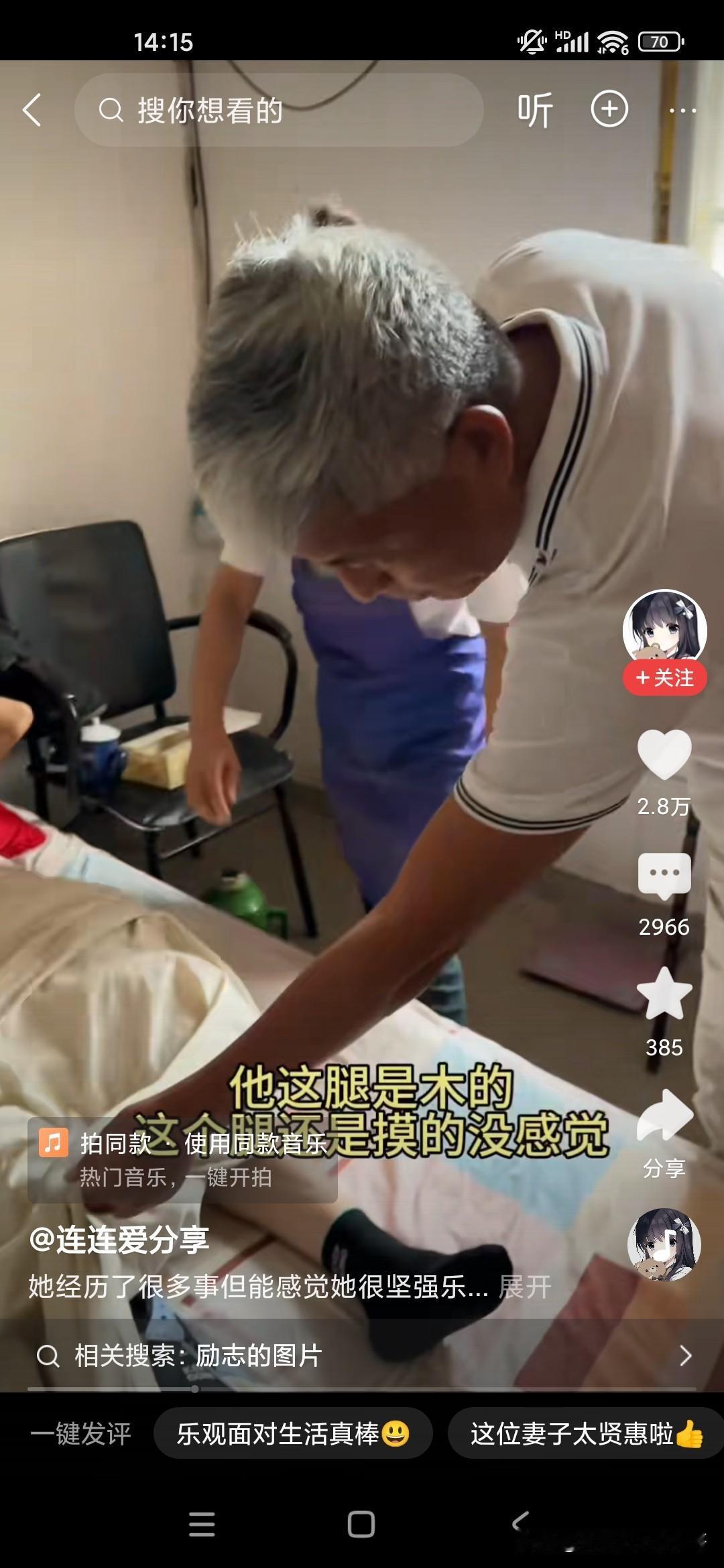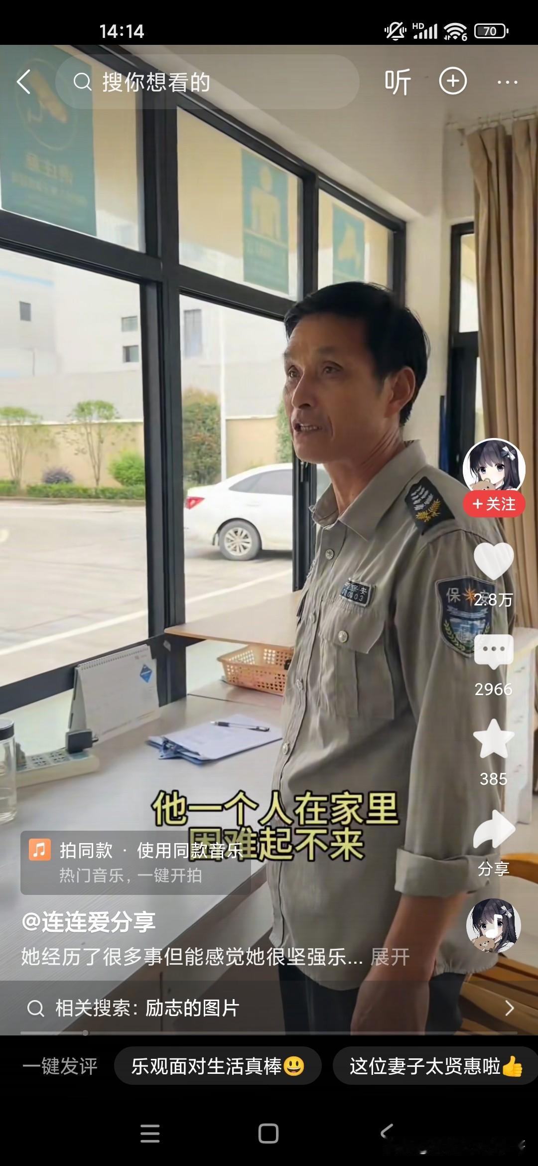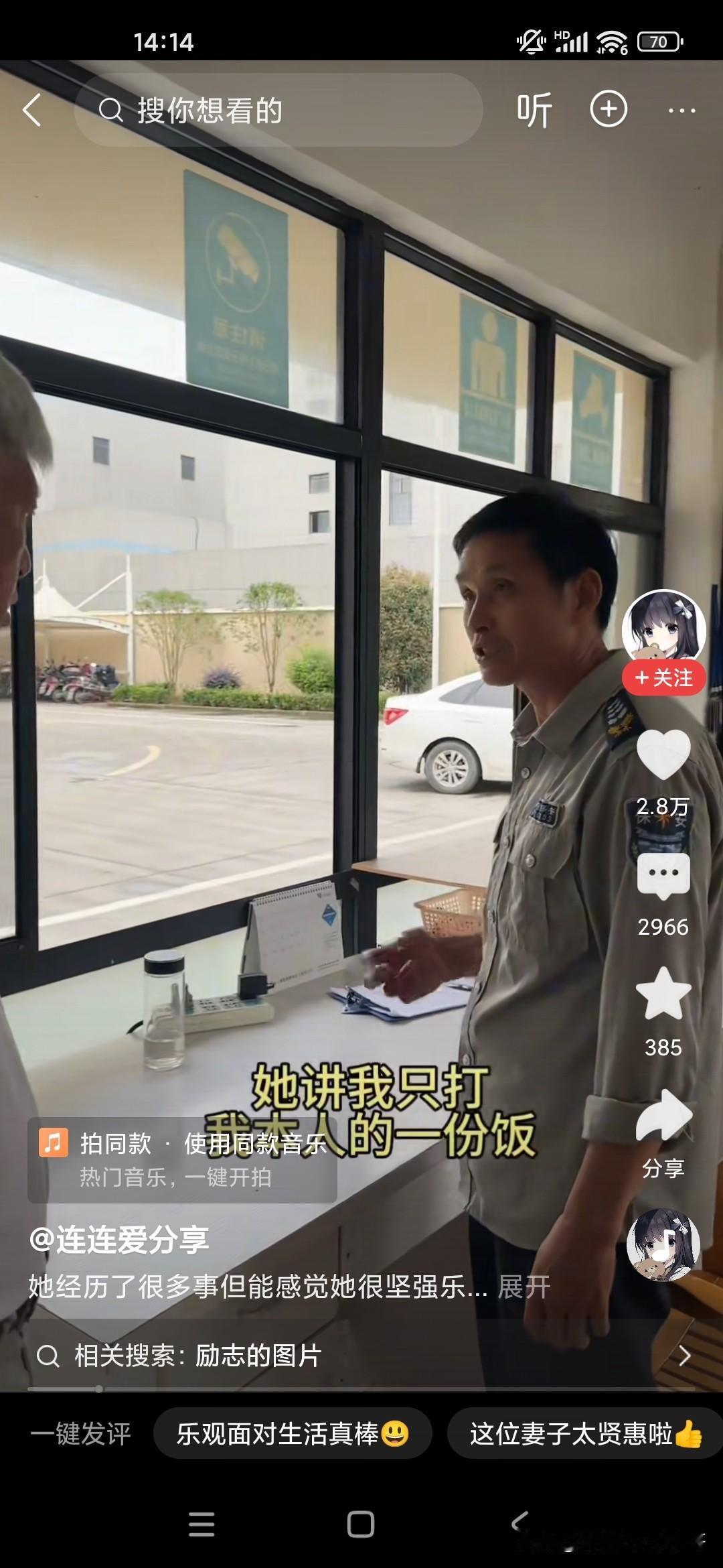 现在这么有情有义有恩的夫妻已经很少见了,她丈夫因为在建筑施工的时候从高楼上摔了下来,就进入了芜湖人民医院,当时因为没有医保,就自费花了20多万,把整个家底儿都掏空了,他们又没有孩子,没有办法,妻子只能去工厂里打工,养活老公,她老公现在的话腿已经完全麻木了,没有知觉,只能是慢慢静养,他妻子去餐厅里吃饭的时候,每次只吃一点点,剩下的留给她丈夫,当时保安还感觉很奇怪,因为工厂里边有规定不允许带饭回家,当时就问他是怎么回事儿,他说家里他男人特殊情况,希望把饭带回家,他回去做饭的话,有时候时间也来不及,然后的话就这样一次又一次带饭回家,后来他领导来视察,保安的话就向这个领导说明了情况,领导看了之后眼睛都湿润了,然后决定带他的线长去他家实地考察一下,才发现这种情况是真的,他当时就转给了她卧病在床的丈夫1000块钱买些营养品,自己也带了一些水果和棉被啥之类的,说他有什么困难的话,可以及时向行政领导汇报,工厂会尽他们所能帮助这位员工,当时这个女员工感动的就要哭了,就没有想到厂里领导会这么关心员工,这其实形成了一个非常温暖的这个案例,其他人看到我们的厂长对我们这么有情有义,他们只会拼命卖力去干活来回报这个工厂!