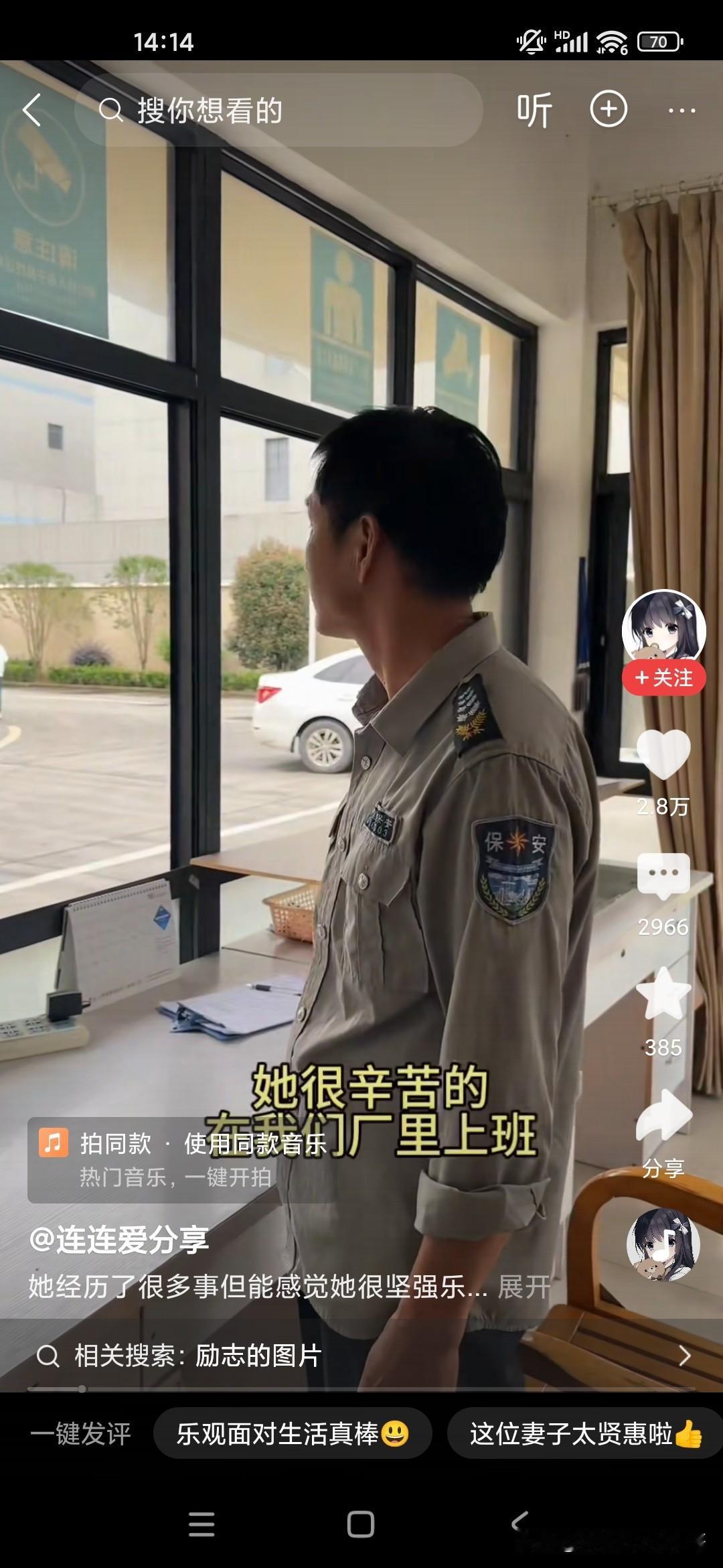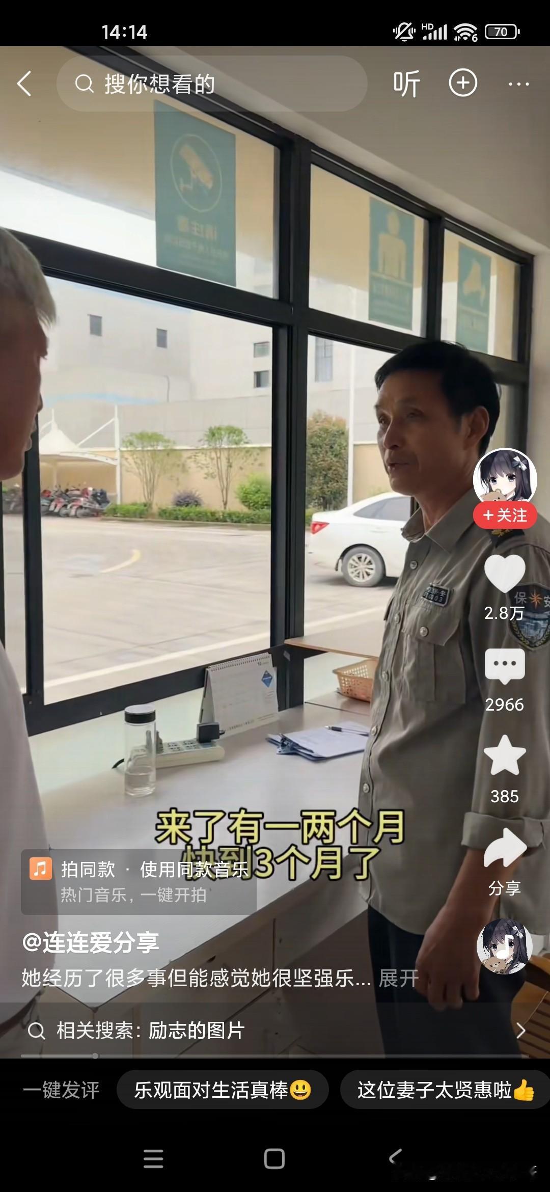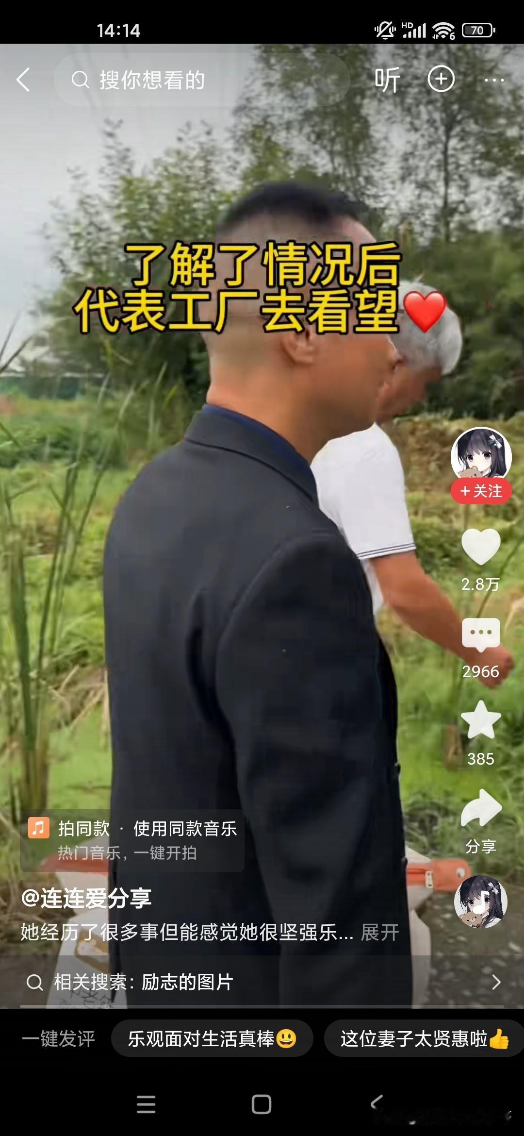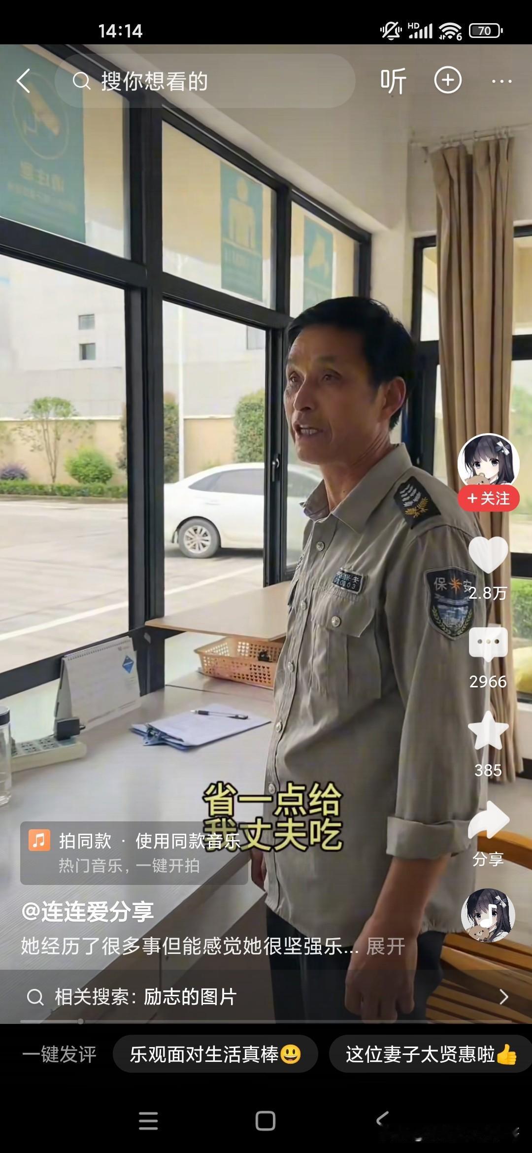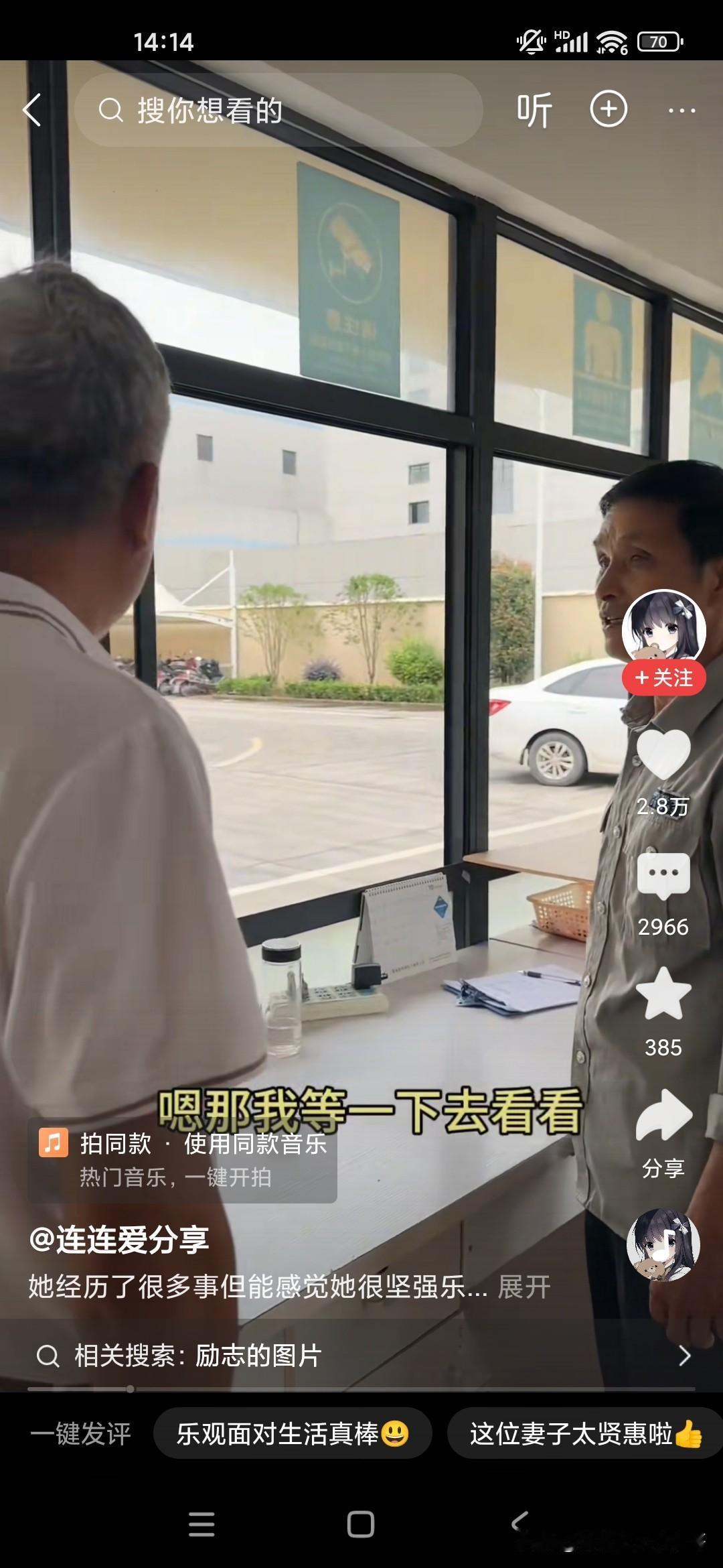 现在这么有情有义有恩的夫妻已经很少见了,她丈夫因为在建筑施工的时候从高楼上摔了下来,就进入了芜湖人民医院,当时因为没有医保,就自费花了20多万,把整个家底儿都掏空了,他们又没有孩子,没有办法,妻子只能去工厂里打工,养活老公,她老公现在的话腿已经完全麻木了,没有知觉,只能是慢慢静养,他妻子去餐厅里吃饭的时候,每次只吃一点点,剩下的留给她丈夫,当时保安还感觉很奇怪,因为工厂里边有规定不允许带饭回家,当时就问他是怎么回事儿,他说家里他男人特殊情况,希望把饭带回家,他回去做饭的话,有时候时间也来不及,然后的话就这样一次又一次带饭回家,后来他领导来视察,保安的话就向这个领导说明了情况,领导看了之后眼睛都湿润了,然后决定带他的线长去他家实地考察一下,才发现这种情况是真的,他当时就转给了她卧病在床的丈夫1000块钱买些营养品,自己也带了一些水果和棉被啥之类的,说他有什么困难的话,可以及时向行政领导汇报,工厂会尽他们所能帮助这位员工,当时这个女员工感动的就要哭了,就没有想到厂里领导会这么关心员工,这其实形成了一个非常温暖的这个案例,其他人看到我们的厂长对我们这么有情有义,他们只会拼命卖力去干活来回报这个工厂!