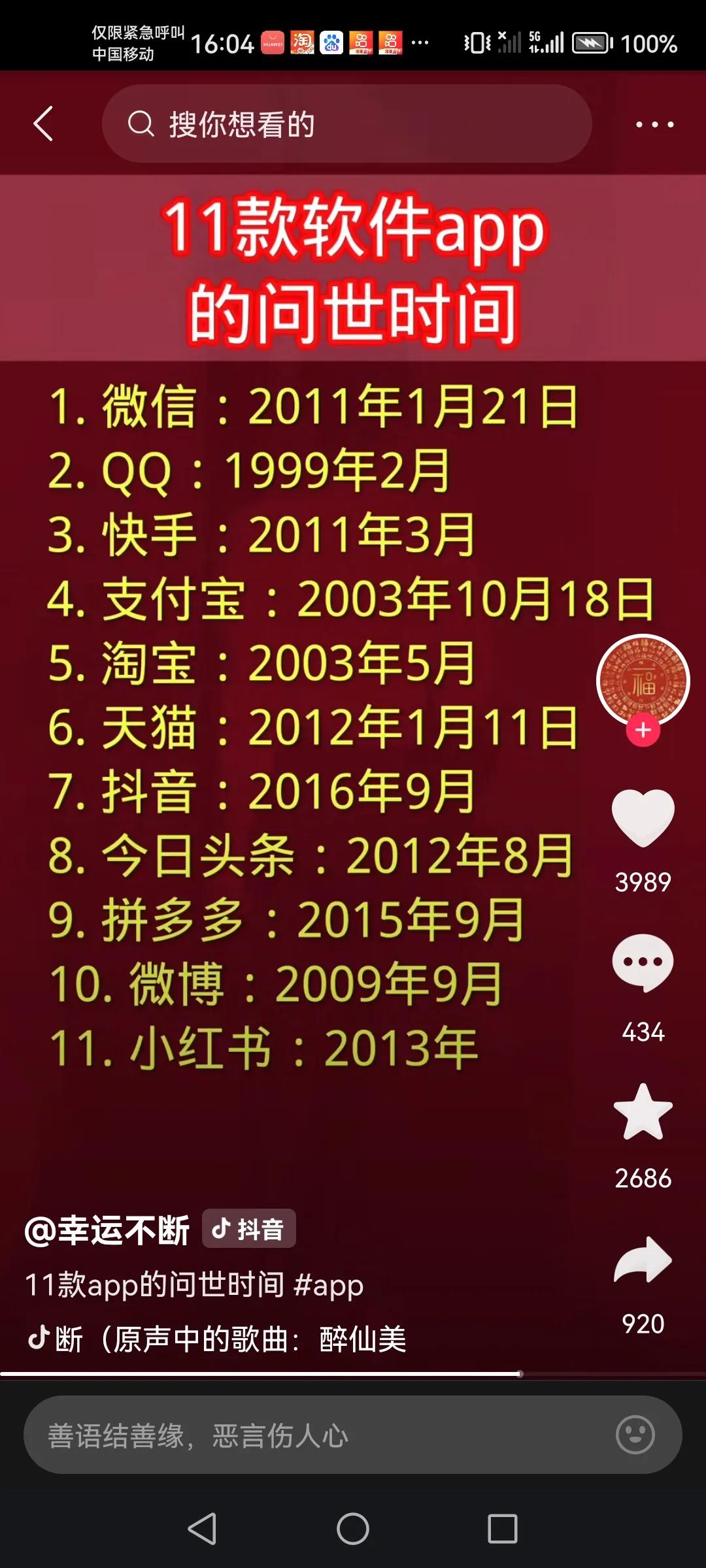 十一款软件APP的问世时间点 QQ是最早的了 大家都还有在用QQ吗? 我的都好长时间没有登录了 时间长了QQ会不会登不上了 反正好几年没有用了 以上仅供参考!这也是一种回忆啊