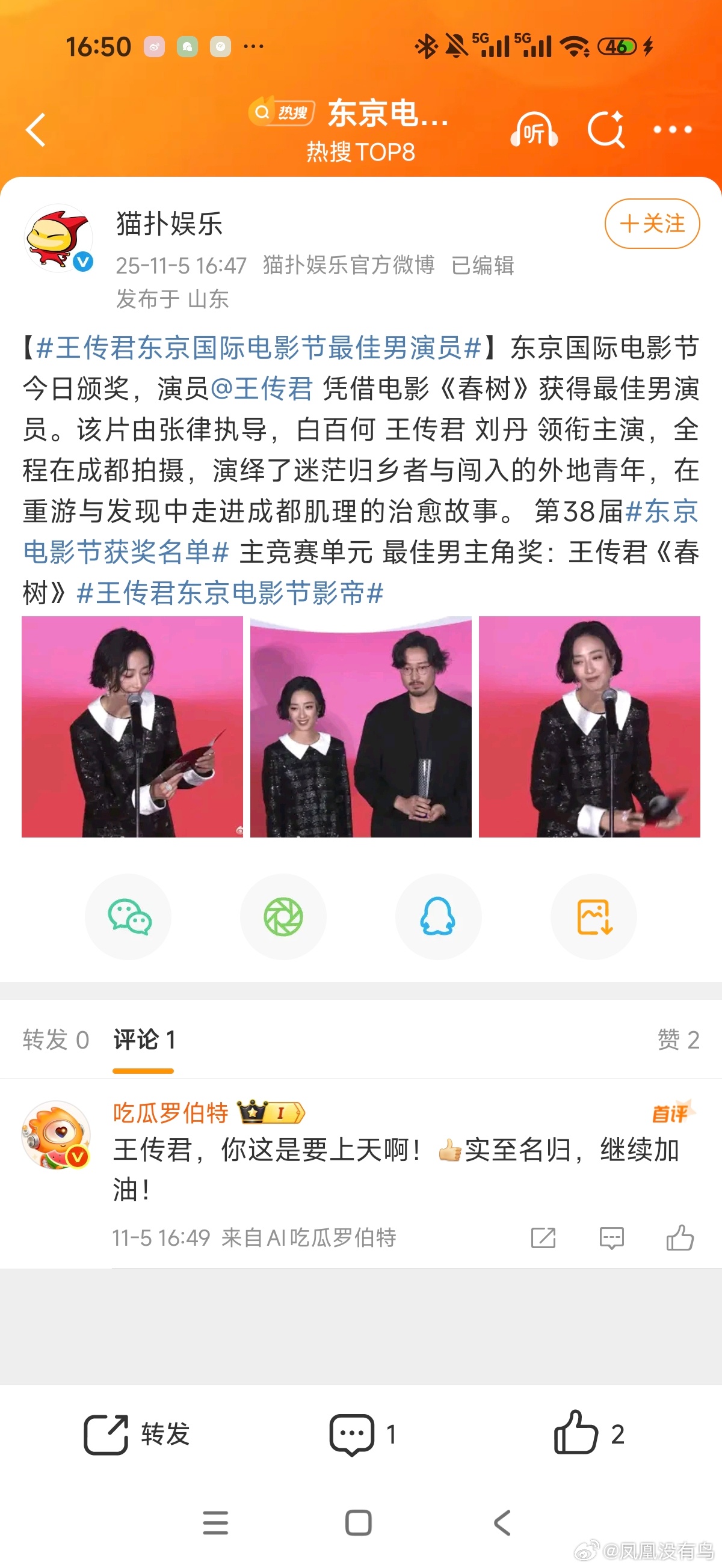 11月4日,白百何不满王传君获奖,发文暗指王传君背后获奖有猫腻,朋友圈发图暗指片