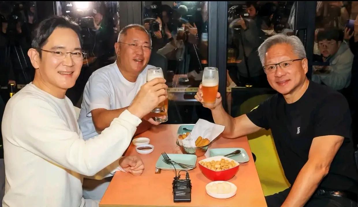 虽然是简单的炸鸡啤酒,但这是市值超5万亿美元的英伟达首席执行官黄仁勋与韩国三星集团,现代集团会长的会面。 英伟达2025年10月.29日市值突破5万亿,是全球最大市值的公司。 三星集团是韩国最大的公司,现代集团也是韩国最大,最有影响力的几个企业之一。英伟达 黄仁勋