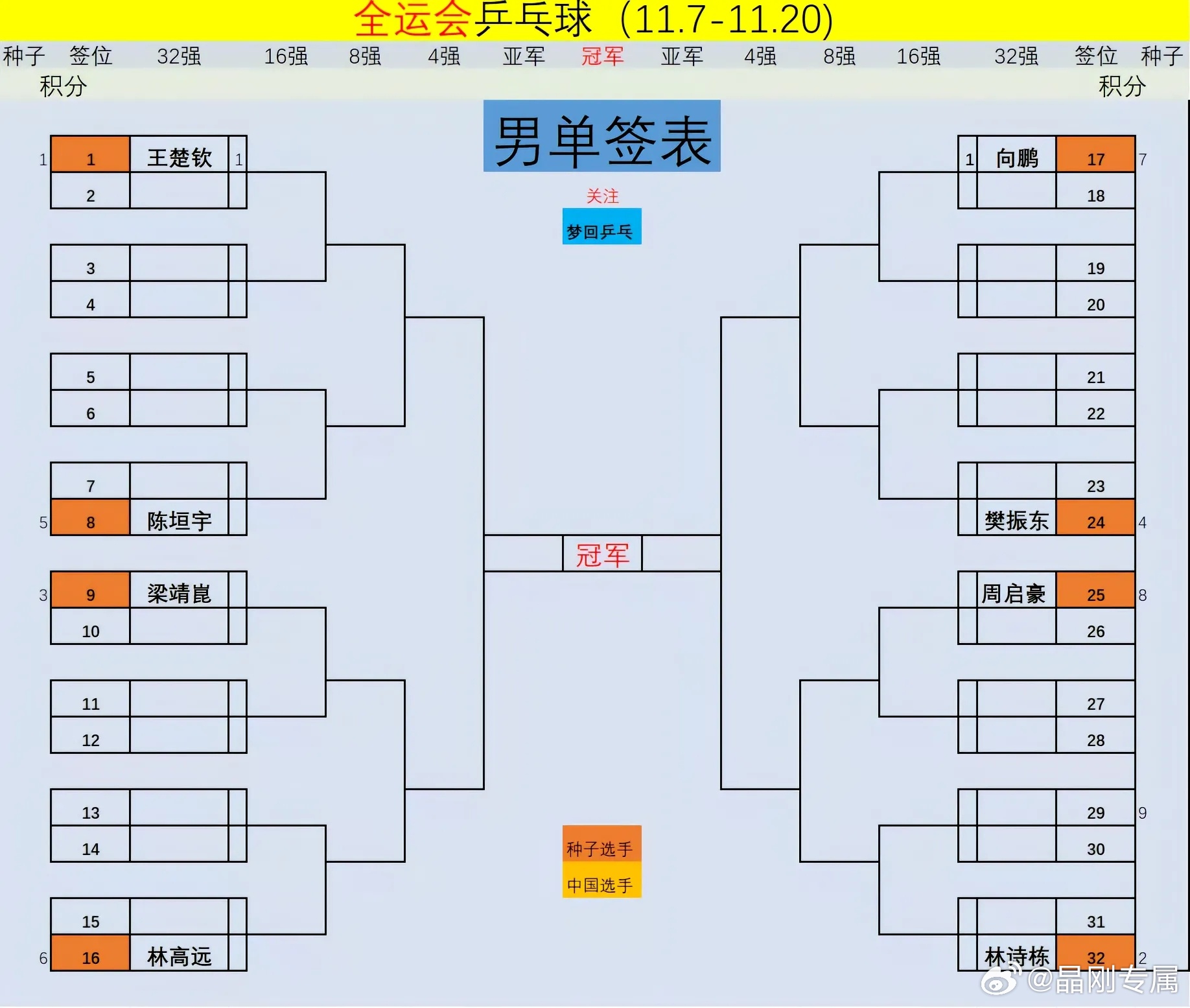 王楚钦樊振东男单同一半区全运会乒乓球男单签表