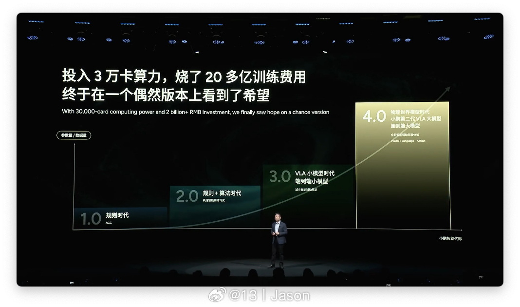 显然,小鹏此前都在提及和运用标准 VLA,而创新的 VLA 一直在默默地烧钱——投入 3 万卡算力,烧了 20 多亿训练费用,终于,在一个偶然版本上,看到了希望。何小鹏首次披露物理AI巨大进展
