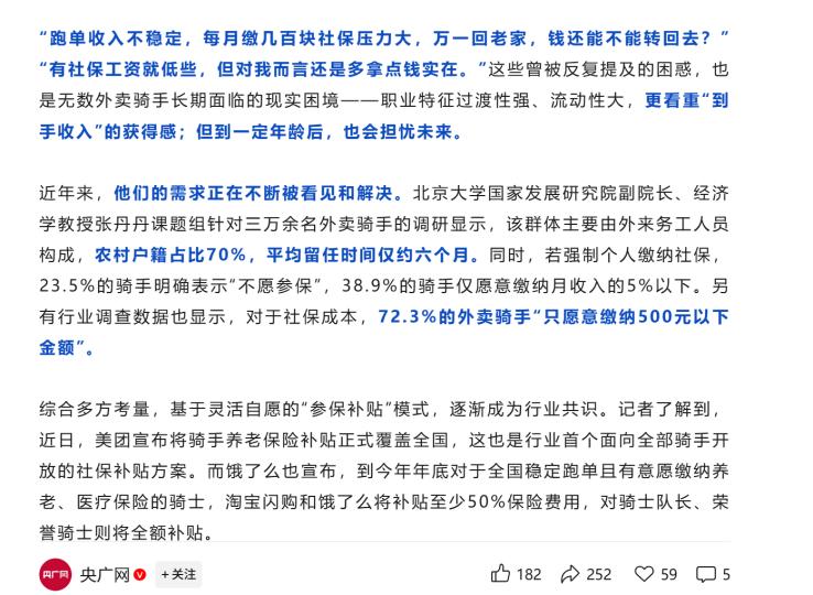 外卖这行如今是真变了!平台相继发力骑手保障,从目前的结果来看,已经跟其他蓝领拉开差距了。 以前总觉得平台搞保障多是噱头,也经常吐槽骑手保障落实不到位,但今年确实不一样了。如果说今年年初初东哥宣布给骑手缴社保,算是给行业开了个好头。那美团这次就算是给骑手社保这事收了个扎实的尾。 对比来看,东哥的方案只覆盖了15万左右的全职骑手,主打一个小而美。而美团最近实行的方案,虽不如东哥的五险一金豪华,但却更符合国家普惠的思路:不管是天天跑单的全职骑手,还是偶尔接单的众包骑手,只要达到最低条件,都能领到社保补贴,直接覆盖了几百万灵活就业的骑手 说实话,美团这次的方案虽然算不上好,但确实是把骑手社保的难题撞开了条新口子,成了首个覆盖全部骑手社保的平台。不然央媒也不会集体点赞,称“美团这次缓解了传统社保转移接续难的问题,为制度创新提供了宝贵的实践基础”。 更关键的是,这股保障热潮还会继续蔓延。大伙可想象一下,如今骑手行业的保障水平已经甩了同圈层职业一大截——比网约车司机、餐饮服务员、家政人员这些行业都要完善,尤其是社保,目前看是第一个实现全面覆盖的行业。这也算是给其他蓝领行业打了个样,其他行业想要跟进,也能有路可循。 从东哥开先河到美团全面落地,骑手行业终于告别了“没社保”的时代。这种平台间的良性带动,不仅让新就业形态劳动者看到了保障希望,更让骑手职业真正成为一份有尊严、有托底的工作。希望其他蓝领行业也能快速跟进,让灵活就业群体不再是“没有保障”的代名词。