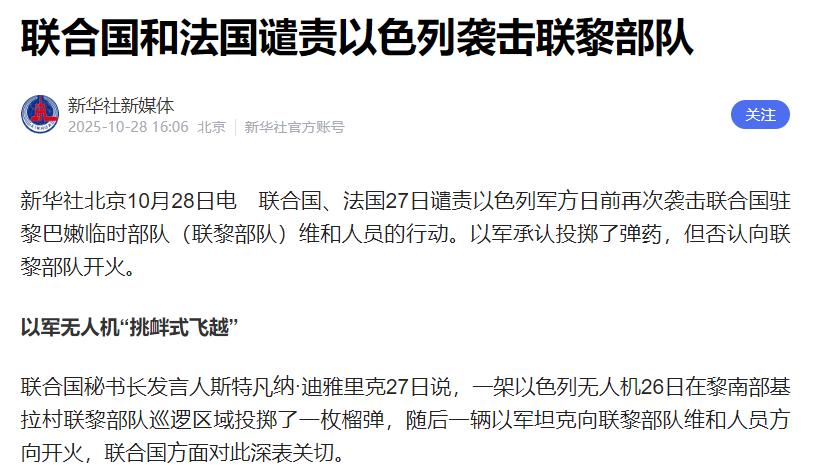 联合国终于不再忍耐,维和部队对以色列开火,法军开第一枪! 近日,在黎巴嫩南部的基拉村地区,隶属于联合国驻黎巴嫩临时部队(联黎部队)的法国维和军人,在执行任务时采取了防御性反击行动,当场击落了一架闯入任务区域的以色列军方无人机。这并非维和部队的贸然行动,而是在多次警告无效后的必要举措。 事情的起因要追溯到巴以停火协议达成后,在过去的10月里,以色列军队在不到10天内连续三次对联黎部队的法国维和分队实施袭扰。 第一次发生在10月18日,法军按计划在基拉村附近执行巡逻任务时,一架以色列“苍鹭”无人机未经通报便低空闯入巡逻路线,在维和车辆上空持续盘旋近20分钟。 期间多次无视维和士兵发出的警示信号,直至法军启用地面干扰设备后才撤离,此次干扰导致巡逻任务延误约1小时。 第二次袭扰发生在10月26日,以军无人机再次出现在法军报备的巡逻区域,不仅低空飞越还投掷了一枚榴弹,落在维和部队防御工事附近造成轻微损毁。 随后以军一辆坦克向维和人员方向开火,联黎部队当即发表声明谴责这一违反安理会第1701号决议的行为,并向以方提出强烈抗议,但除了保证什么下文也没有了。 第三次则是10月27日晚间,两架以军无人机直接飞向法军临时营地,其中一架投放小型炸弹导致营地外围工事受损,同时以色列一侧的两辆梅卡瓦主战坦克向营地方向炮击,炮弹落点距营地仅100米,造成通讯设备短暂中断。 这三次袭扰中,以军均以“执行反恐任务”或“情报收集”为由辩解,未提供任何证据,且行动已严重威胁到维和人员的生命安全,联黎部队不得不在又一次的袭扰中授权士兵采取自卫措施,最终击落一架无人机。 私以为,既然以色列选择与巴勒斯坦达成停火协议,就应当严格遵守停火精神,停止一切可能激化地区矛盾的军事行动,更不应该将军事活动延伸到黎巴嫩方向。停火协议的本质是为了给冲突地区带来喘息之机,任何单方面的挑衅行为都可能打破这种脆弱的平衡。 法军此次击落无人机的行动,显然只是一个警告信号,意在提醒以色列尊重维和部队的中立地位和执行任务的权利。 回顾联黎部队的维和历程,类似的干扰事件虽偶有发生,但像这样连续多次针对特定国家维和分队的情况并不多见。而根据联黎部队的行动准则,在自身安全或任务执行受到严重威胁时,有权采取包括武力在内的必要措施进行自卫。 如果以色列继续无视维和部队的存在,持续骚扰其工作,未来很可能会面临更严厉的反击。 当前地区局势本就敏感复杂,各方都应保持克制,避免因局部摩擦引发更大规模的冲突,这既不符合地区各国的利益,也违背了国际社会对和平的共同期盼。