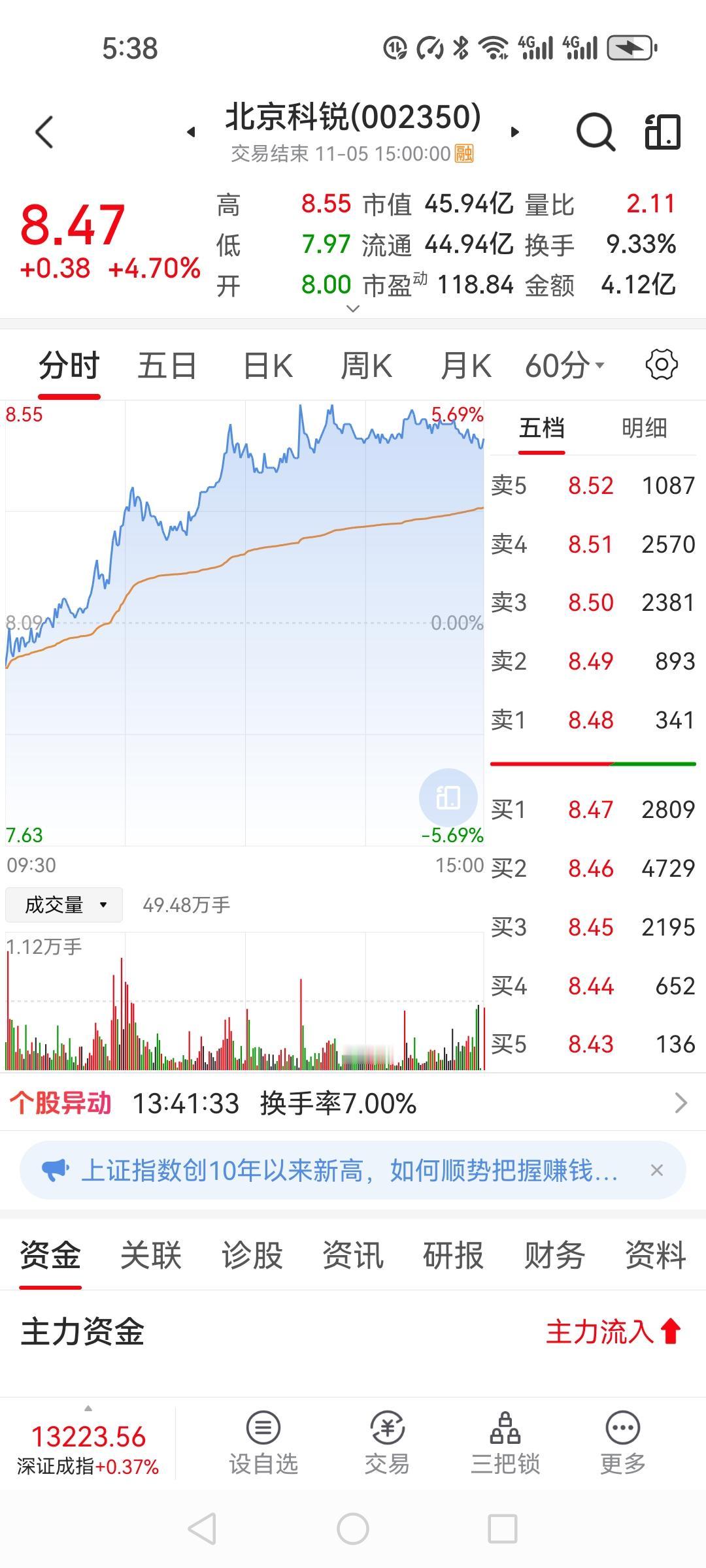 你们用炒股软件吗? 昨天我买的北京科锐8.12买的,8元低开一路让行,上午最高涨到8.38元,又做小幅回调,这是软件就出现了小绿锁,根据软件介绍,绿锁出现就是卖点,我也担心下午大盘再下调,我就8.38挂上,一会就成交了,盈利245元,成交以后,股价还是上涨,最高涨到8.55元,收盘8.47,最少损失150元。 如果没有软件,我可能要等到明天再卖,相信了软件没抱住。可能也不是坏事,说不定明天还会下跌调整。 你们用软件都是什么情况,准确率能达到多少?有好的可以推荐一下
