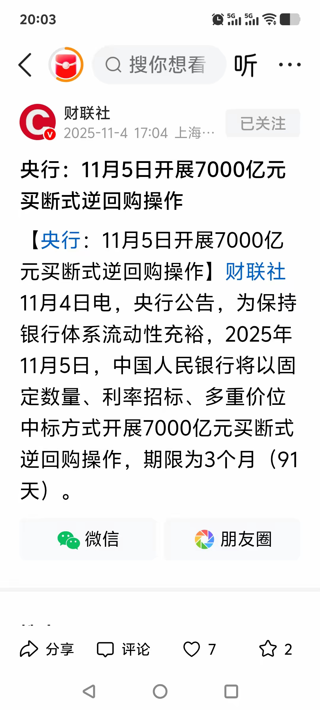 种种迹象表明,全球市场肯定是受某种因素影响了,不过大家不用担心,就在昨日收盘,央妈再次出手,今天将开展7000亿元的买断式逆回购操作,为期3个月。