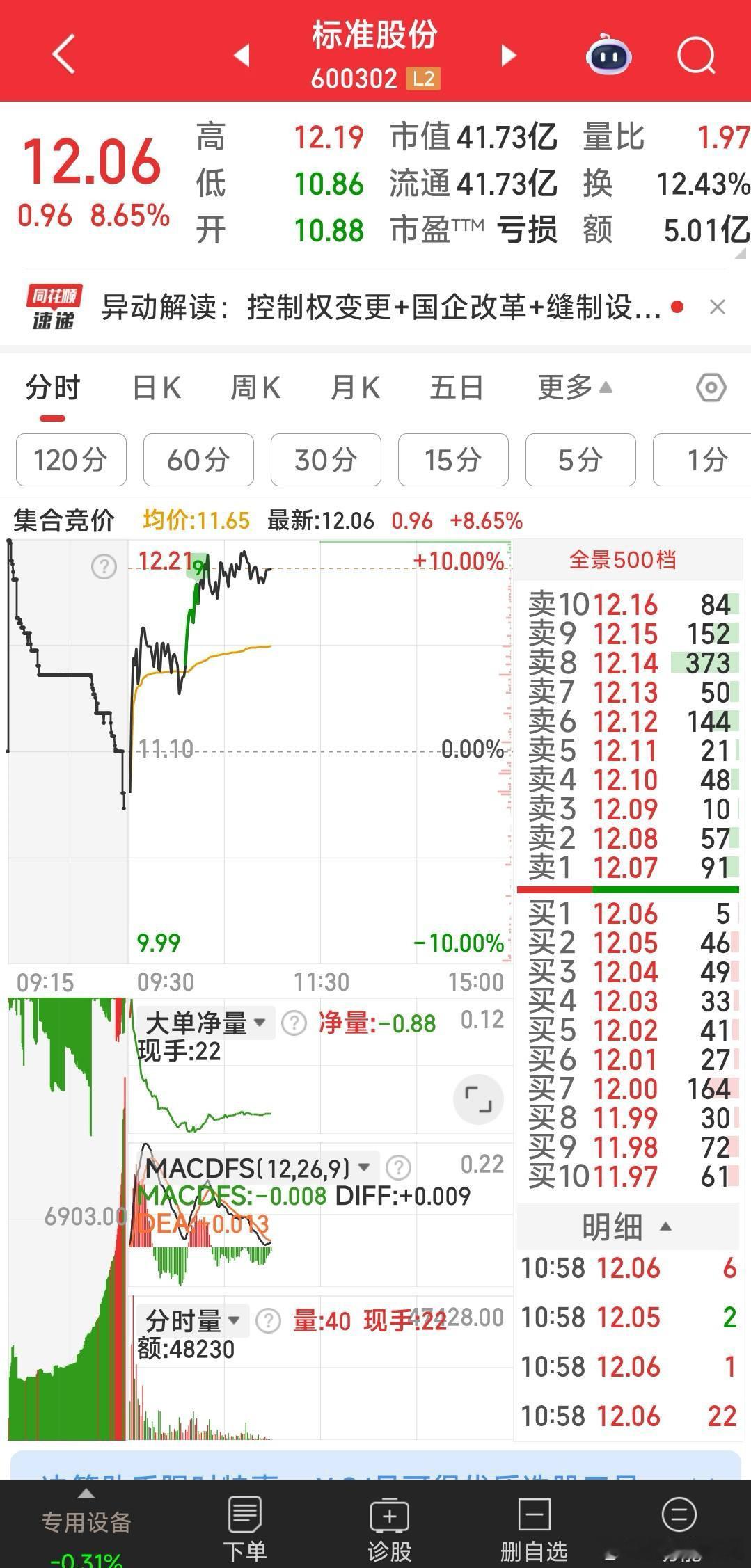 标准股份涨停板价12.21元才挂14133手,看着,我叫朋友给他吃掉。明天开始秒