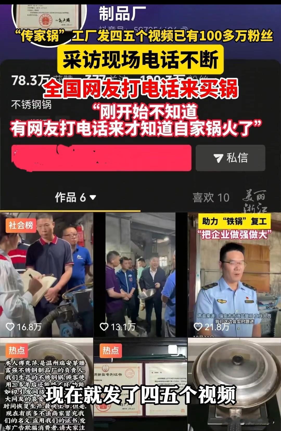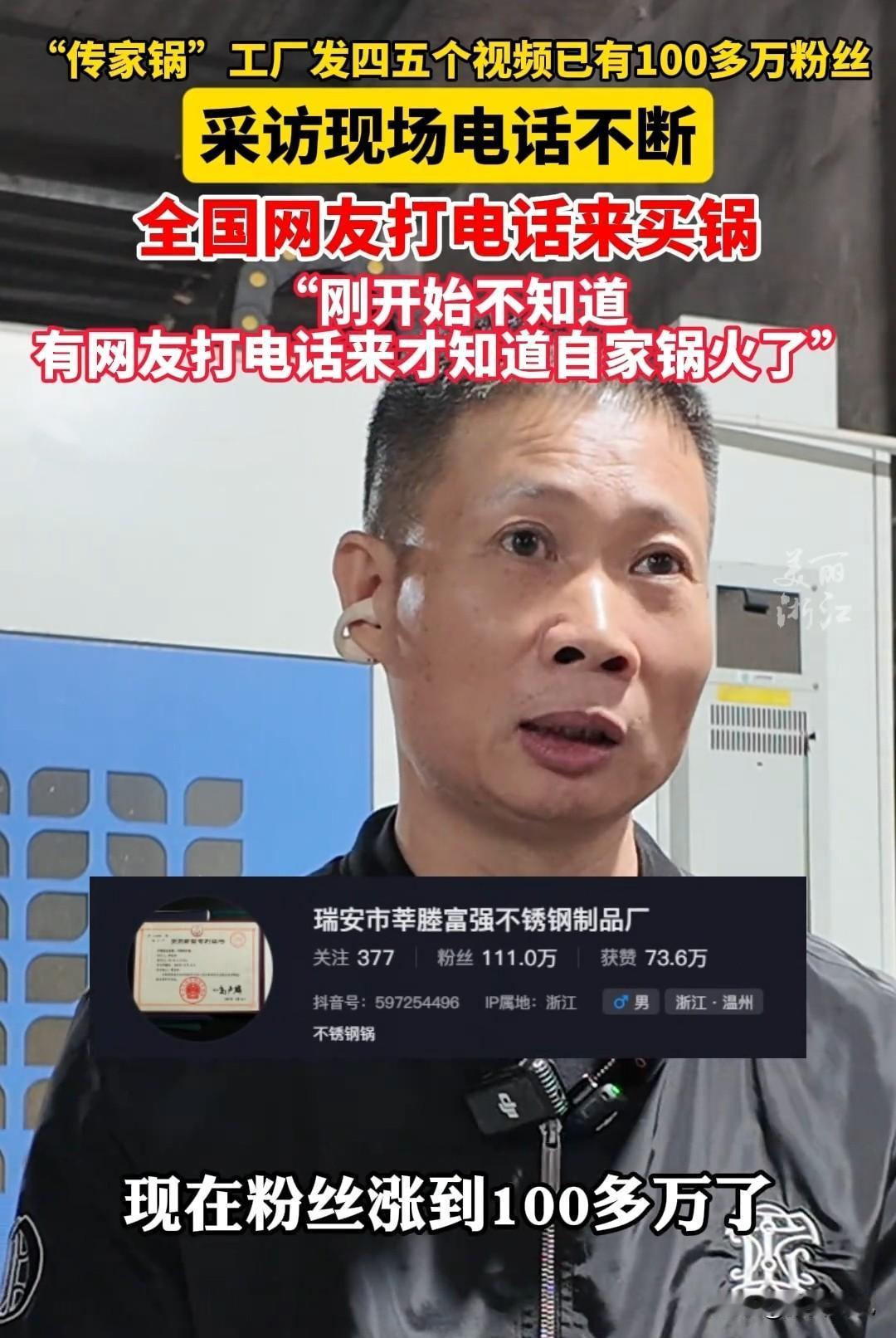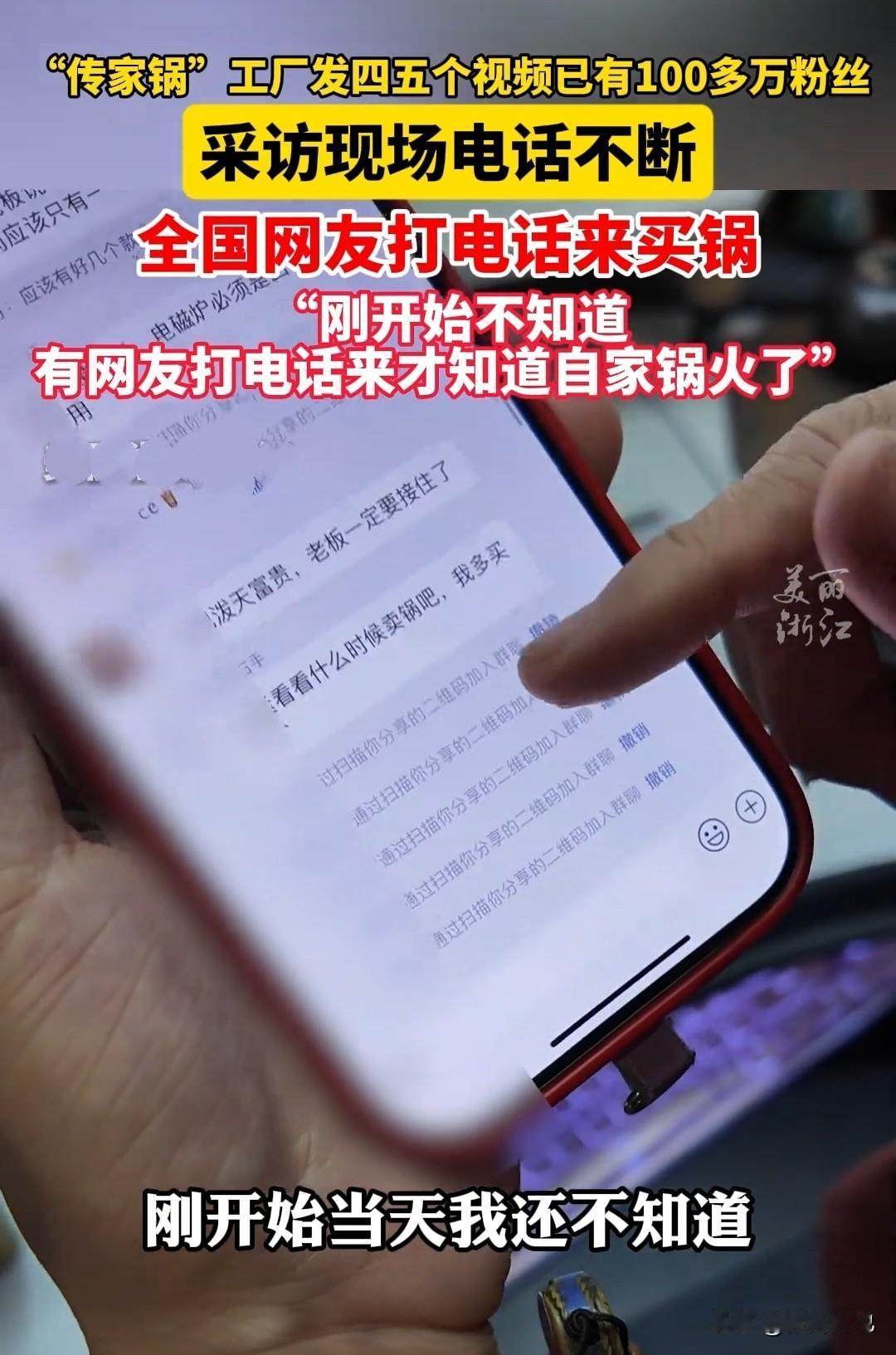 “传家锅”火得一塌糊涂了,老板还不知道自家锅火了,憨厚的样子透着淳朴:看情况吧,有需要会直播。 近日,网上一款可以用二三十年的传家锅火遍大江南北,微信群已经建了一两百个,粉丝也涨到了一两百万,而据工厂傅老板说才发了四五个视频。 采访时傅老板的电话一直铃声不断,全是要买锅的网友打来的,傅老板说当时自己根本不知道自家的锅火了,还是网友告诉自己的,要自己上网看,说很多人在找自己。 现在传家锅还在试产中,如果网友有需要,应该会开直播吧,傅老板说。 不得不说现在的网友真的好厉害,当年的鸿星尔克,活力28,现在的瑞安传家锅,真是倒了的都能给盘活咯。 有网友说一看这老板的面相就是务实的人,和活力28的三位老板好像呢,反正今年的愿望就是买到一个真正的瑞安莘塍富强不锈钢炒锅,因为自己几十年来煎鱼从来没有煎完整过。 只是现在不锈钢锅随便都是两三百起,这傅老板只卖五六十,会不会撑不久呀?网友忧心忡忡。 如果锅上市了,是不是应该给那位发视频全网找锅的网友呀?真是应了三十年河东,三十年河西,没想到三十年后傅老板还是凭借好质量的锅翻身了。 所以说,还是要做良心产品,生命力才能长久呀,大家说是不是这个理?