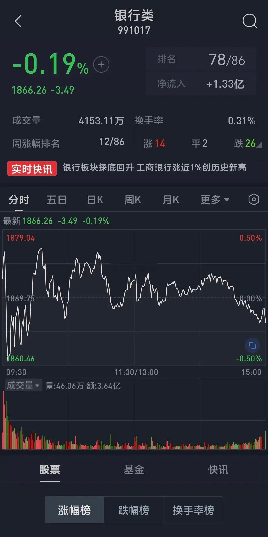 银行股开盘后冲高跳水剧烈震荡,个股出现比较大的分化,厦门银行大跌2.26%,中国银行下跌0.70%,建设银行下跌0.73%,其他下跌的银行股跌幅都在1%以内。工商银行早盘高开冲高跳水下跌,但是有很多资金涌入拉升强势反转,盘中突破7月份高点创历史新高,农业银行稳扎稳打,早盘冲高跳水企稳回升收盘小涨0.37%,今天银行股上涨的仍然比较多,宁波银行最近持续上涨,已经逼近7月份高点,银行指数震荡不意味着行情结束,长线价值投资者千万不要割肉了。