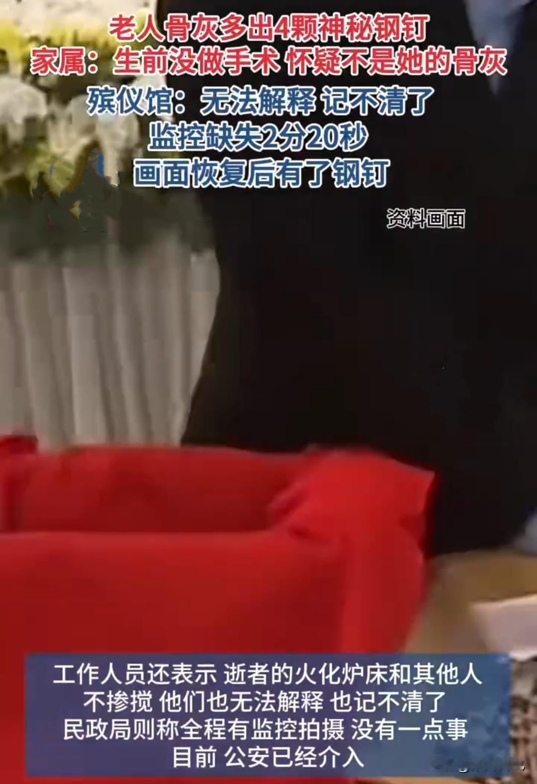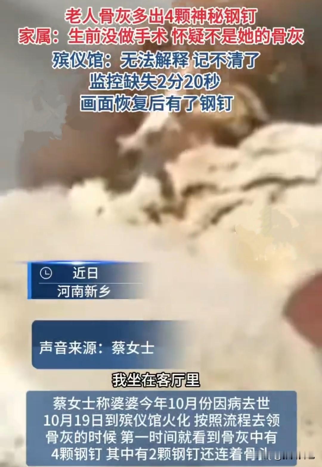 最近,河南新乡蔡女士称,自己婆婆去世后的骨灰中居然有四颗钢钉,因婆婆根本没做过此类手术,这让一家人没办法接受。 据蔡女士说,婆婆十月份因病去世后送到殡仪馆火化,后面自己根据流程去领婆婆的骨灰时,发现骨灰中有四颗钢钉,因婆婆生前身体从来没有做过钢钉手术,那这钢钉是从何而来的呢?而且钢钉还连着骨头,这充分证明这骨灰根本就不是婆婆的呀。 一家人不光纳闷,而且很气愤,这要是没有钢钉,是不是就把骨灰领回去了?那婆婆真正的骨灰到底去了哪里呢? 蔡女士一家希望通过媒体能找回婆婆的骨灰,好让老人早点下葬。没想到记者去殡仪馆核实 时,发现监控视频恰好缺失了2分20秒,而遗体在火化时是没有钢钉的,但视频一恢复就有了钢钉了。 而殡仪馆工作人员解释是线路老化,导致监控部份丢失。这理由实在太巧,让蔡女士一家没法接受。工作人员还称婆婆的火化炉床和其他人的不掺合,但他们也解释不清,因为实在不记得了。 蔡女士一家一怒之下,选择了报警,希望通过警方能顺利找回婆婆的骨灰。 有网友说有时真怀疑殡仪馆烧多了就随便乱装,因为都是一把灰嘛,谁还能认识不成,就象这位,如果不是有钢钉,谁会怀疑不是自家的亲人? 不知道能不能通过做DNA检测来确定一下呢?否则这实在让人难以接受这种事情啊。 以前听说骨灰乱装,还以为是说笑的,没想到真有这种事情!殡葬行业的乱象是该整治一下了,至少让逝者安息,让生者安心!
