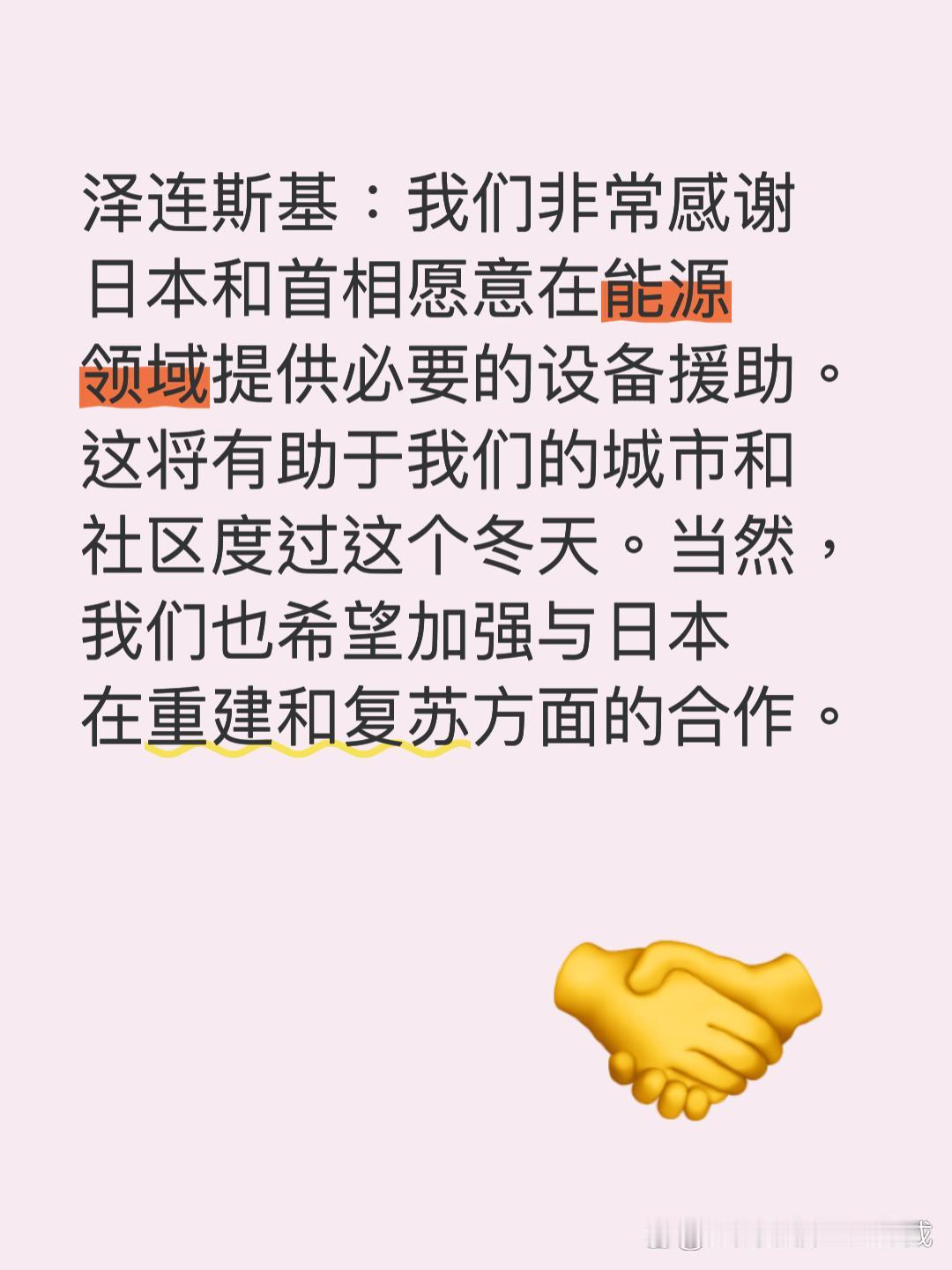 泽连斯基:我们非常感谢日本和首相愿意在能源领域提供必要的设备援助。这将有助于我们的城市和社区度过这个冬天。当然,我们也希望加强与日本在重建和复苏方面的合作。