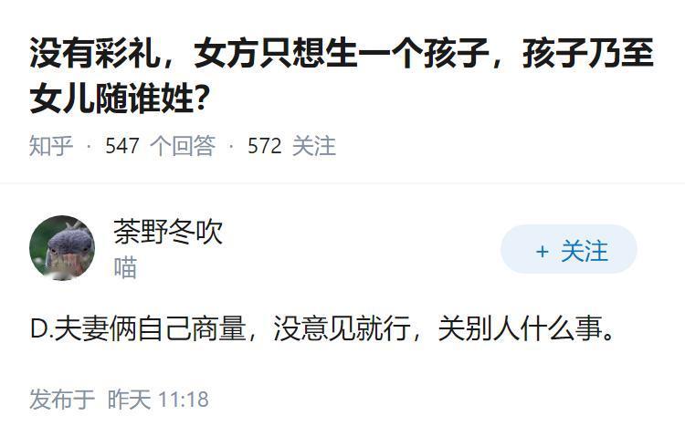 没有彩礼,女方只想生一个孩子,孩子乃至女儿随谁姓?