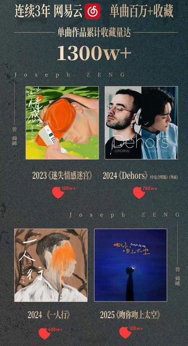 曾舜晞新单曲《吻你吻上太空》收藏破百万,四首单曲收藏累计破1300w+[求关注]