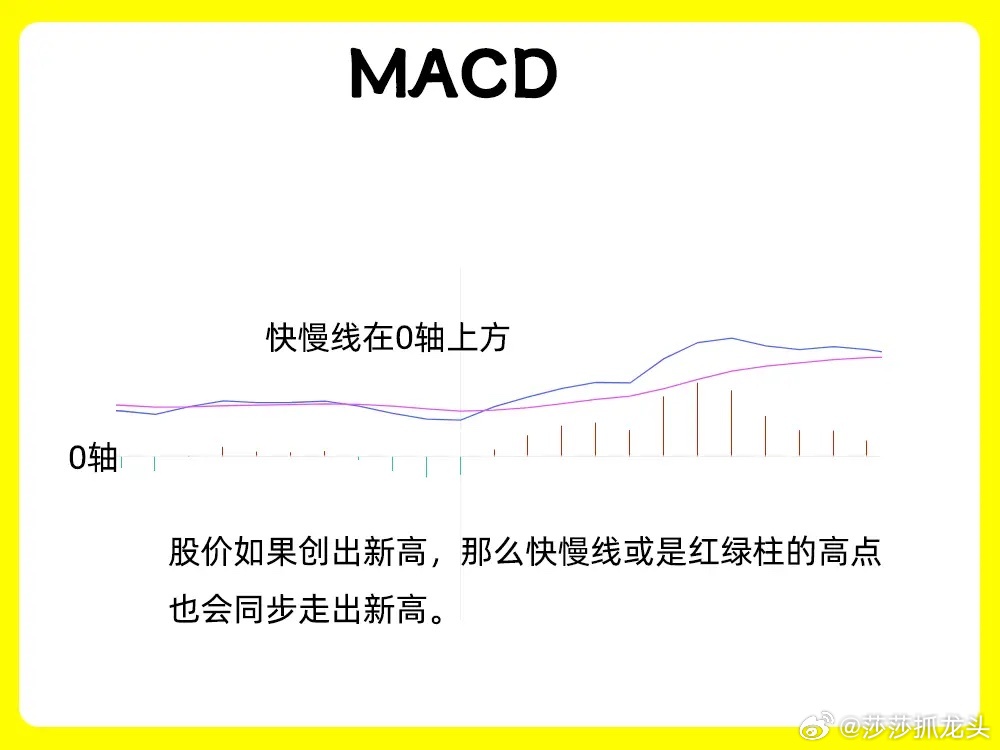 指标的快慢线一般会在0轴的上方,0轴比较重要的一个节点。快慢线会一直向上延伸,股价如果创出新高,那么快慢线或是红绿柱的高点也会同步走出新高。
