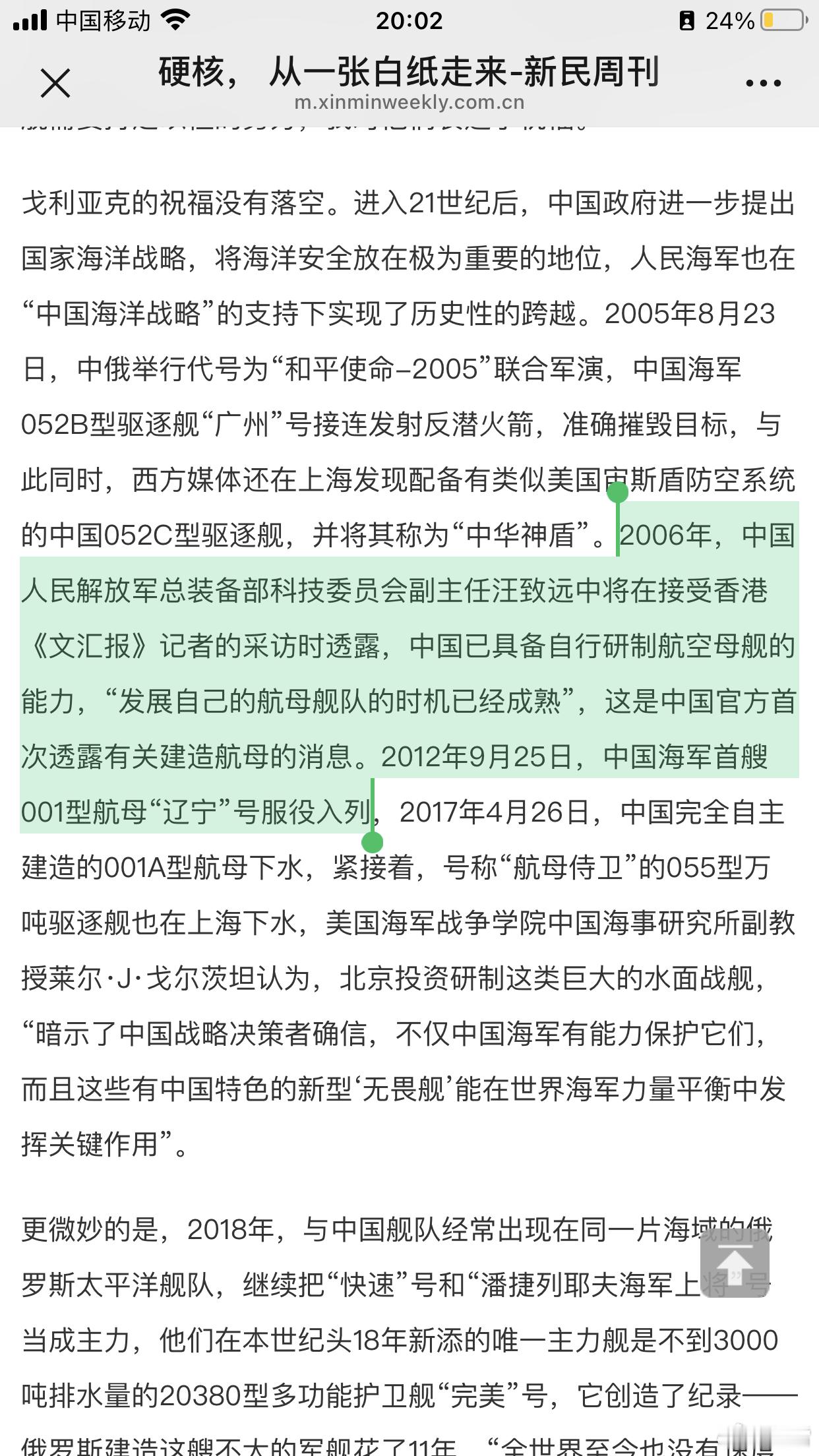 2006年3月 總裝備部科技委員會副主任汪致遠中將:我们自行研制航母(香港文汇报)