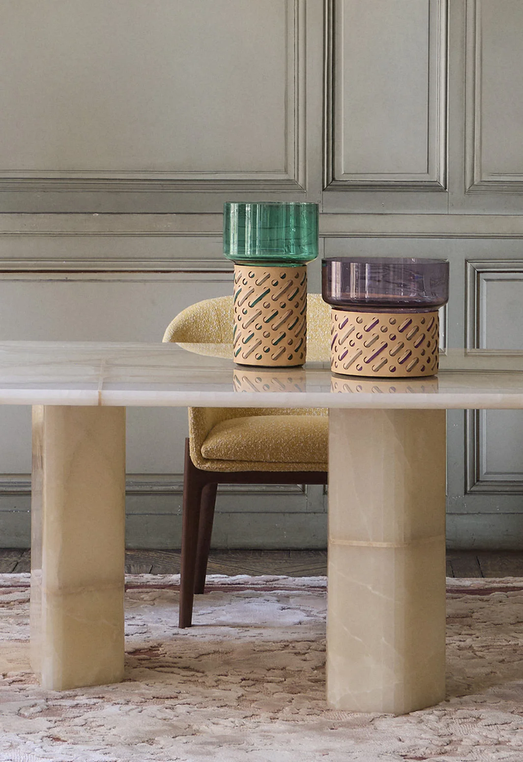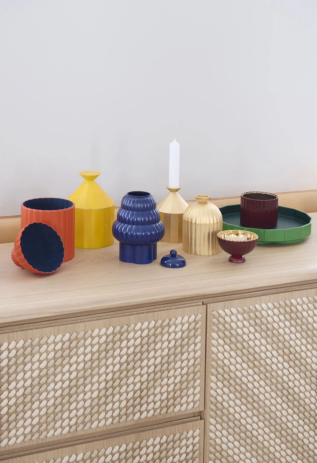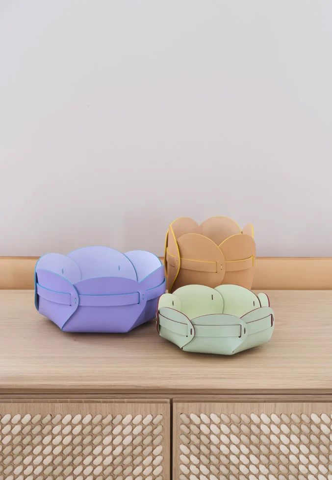 他带来了俏皮又优雅的 Botanik 装饰系列。陶瓷与皮革交织成蜡烛台、托盘、小物盒,不仅是家中风景,也是“奇想功能”的具象表达。🎭🎪