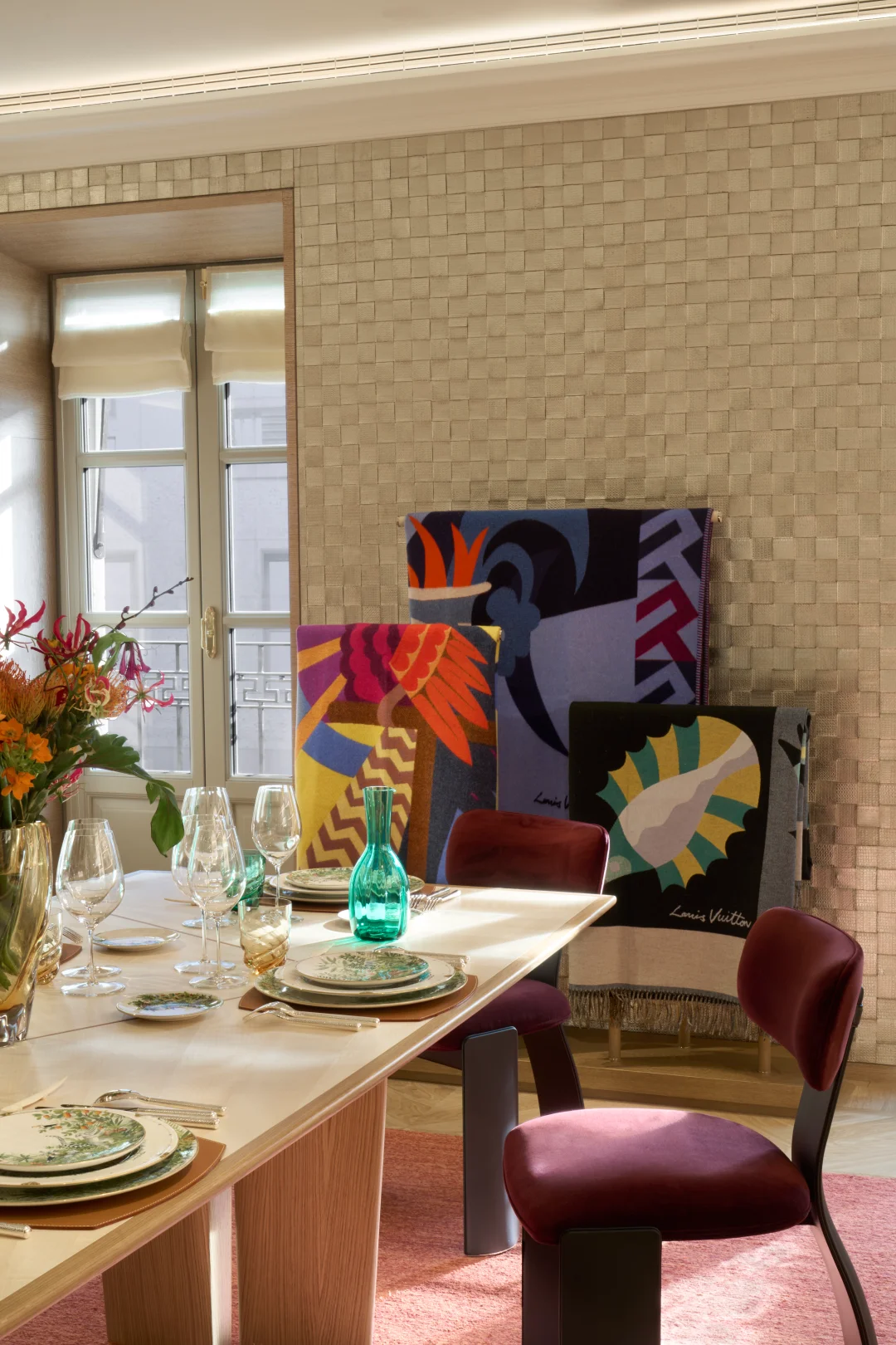 他将拉丁文化中的色彩与自然意象转译为地毯、灯具与椅子🌵 🌋Noé 台灯的设计源自 LV 的经典 Steamer 包,而 Chacana 地毯则像是将安第斯山的地貌铺展在地板上。