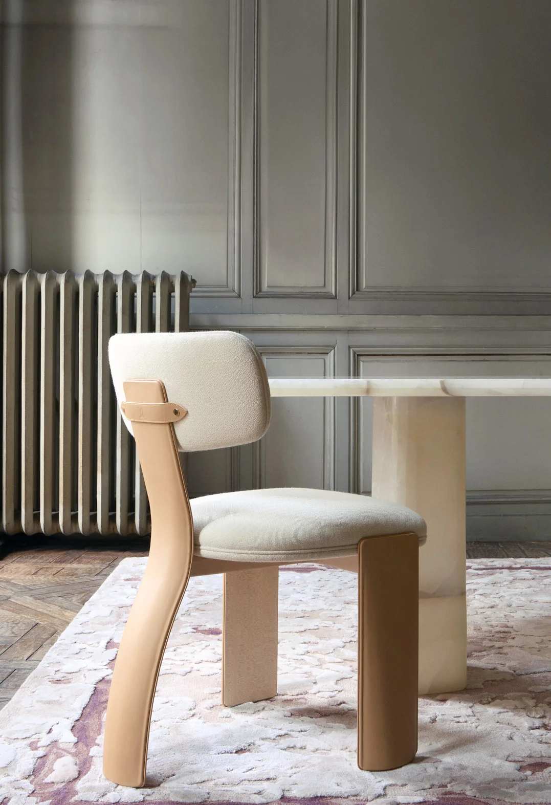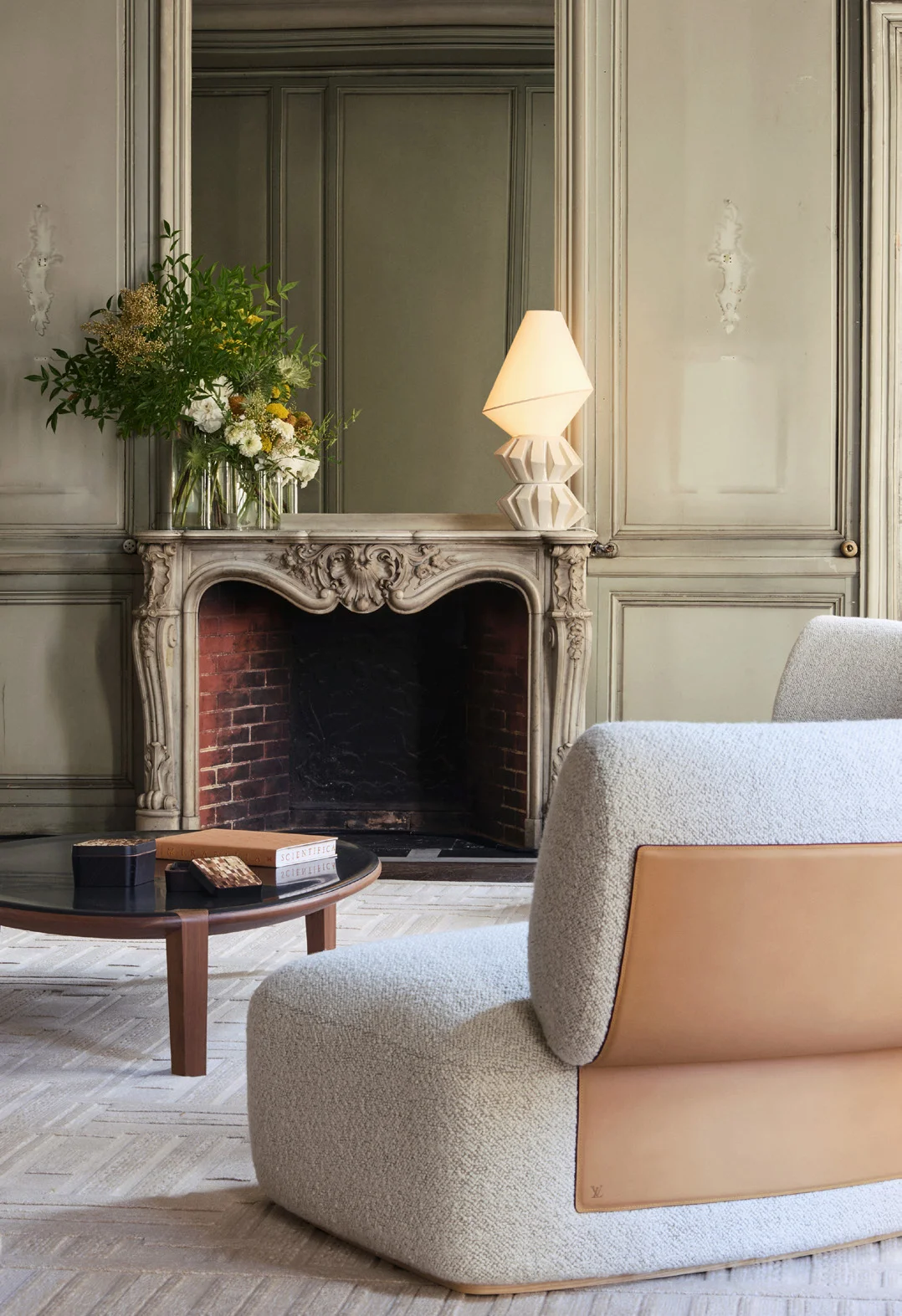 他用“雕塑感”重新定义沙发 🗿 🛋️ 自然马鞍皮包覆的弧形靠背,如雕塑般安放在客厅中央。他的 Puzzle 桌也通过拼花工艺演绎 Damier 格纹——既是家具,也是艺术品。