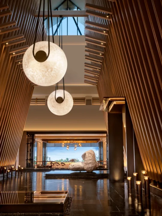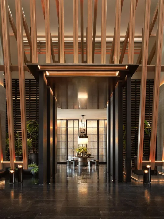 大堂不仅是等候区,而是以水景、格栅与光影构成的开放中庭;