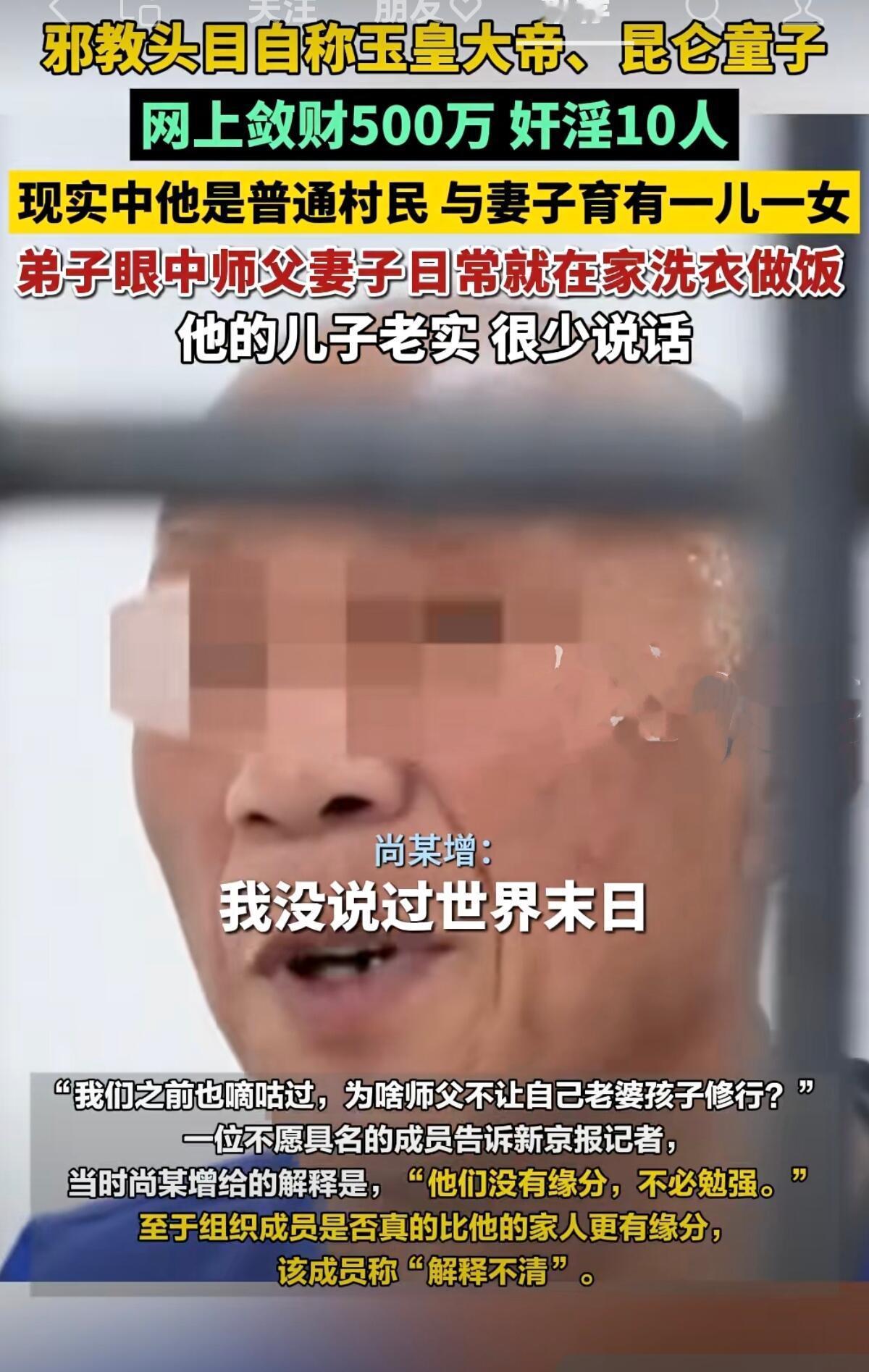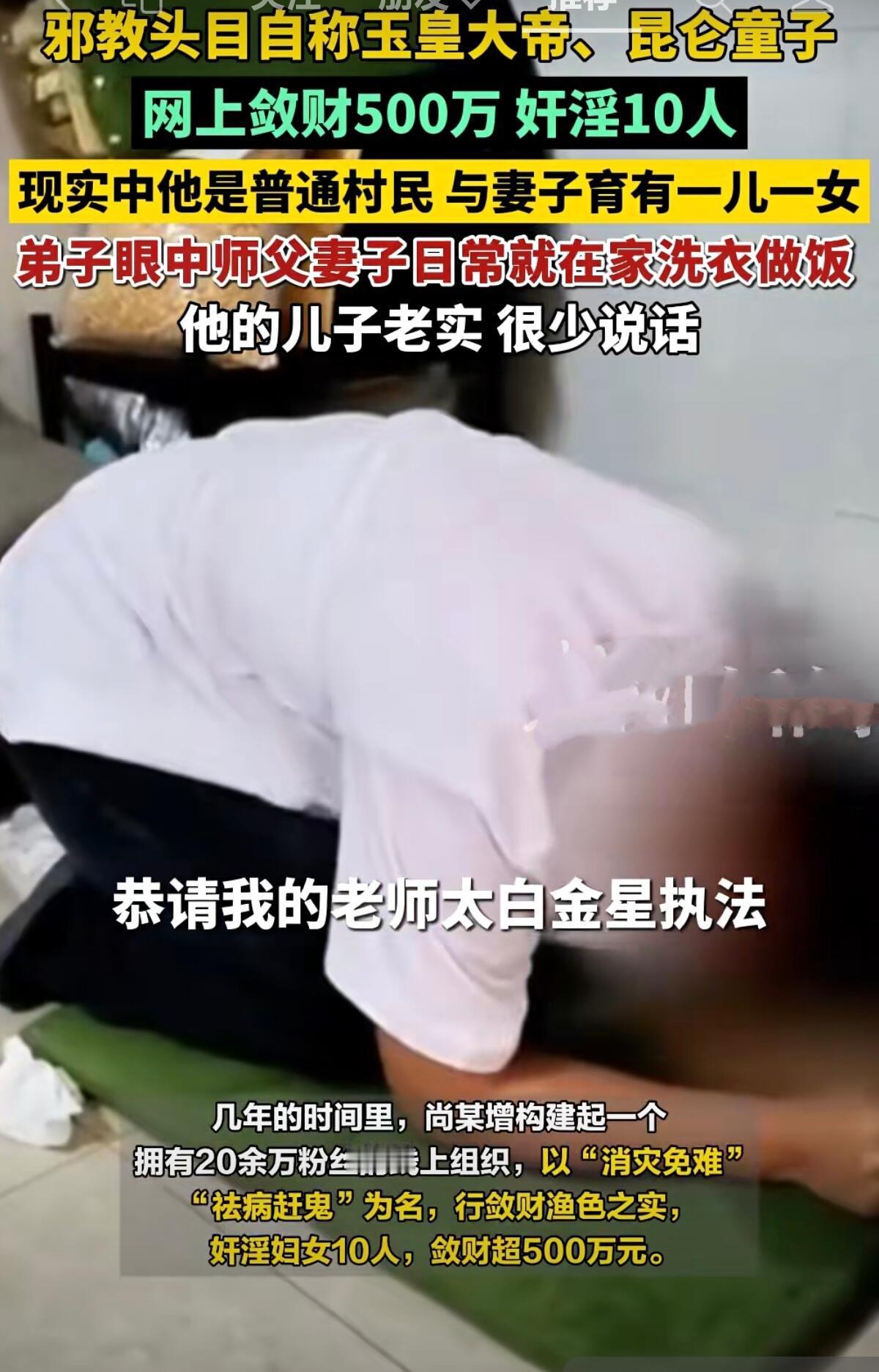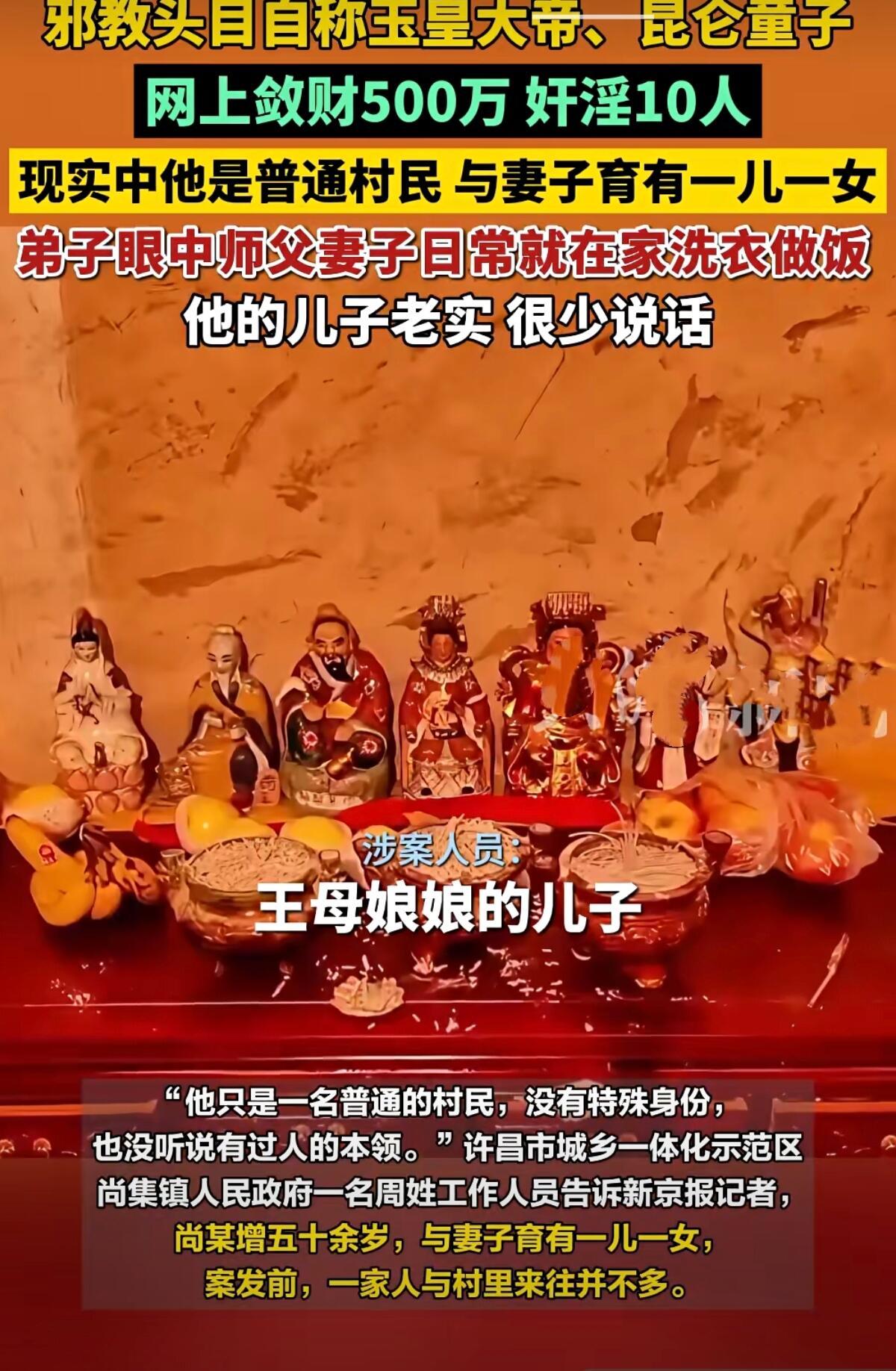 这事儿说出来跟编故事似的——河南许昌一个普通农民,在网上居然自称“玉皇大帝”,靠这套鬼话骗了三千多人,敛财五百多万,还祸害了十个女信徒。直到今年初警察把他抓了,这场荒唐戏才收场。 这骗子叫尚某增,五十多岁,在村里就是个闷声不响的普通人。可一到网上就变了个人——先说自己是什么“昆仑童子”,后来升级成“紫薇圣人”,最后干脆自称“玉皇大帝”,连“地府都归他管”。更离谱的是,他还会借信徒的梦来圆谎。有人说梦见他穿龙袍,他就说自己的“元神”正坐在开封龙椅上;有人梦见哪吒,他就能编出和唐太宗的陈年旧账。 他专挑软柿子捏。那些生病、家庭不顺的人刷到他短视频,他先装知心大哥聊“做人要善良”,等取得信任后,就开始推销“消灾祛病”的套餐。走投无路的人真把他当救命稻草,纷纷上当。 这老小子在网上开了六百多个账号,粉丝二十多万,点击量超五百万。他让核心信徒用暗号联系,形成封闭小圈子。要钱名目五花八门——“功德钱”“香火钱”,有信徒被骗了几十万才醒悟。 最可恶的是,他连女信徒都不放过。编造什么“双修增功力”“神仙让我们做夫妻”的鬼话,胁迫她们发生关系。十个受害女性里,有人被迫多次堕胎,却因为怕丢人不敢声张。 讽刺的是,村里人说他老婆就是个普通农妇,儿子也老实巴交,谁也想不到他在网上竟成了“玉皇大帝”。说到底,他就是抓住了人在困境中容易病急乱投医的心理。那些被骗的,哪个不是生活中遇到了过不去的坎?可惜没等来救赎,反而掉进了更深的陷阱。 现在案子破了,希望那些还迷信所谓“大师”的人能醒醒——真神仙不会让你打钱,更不会逼你上床。