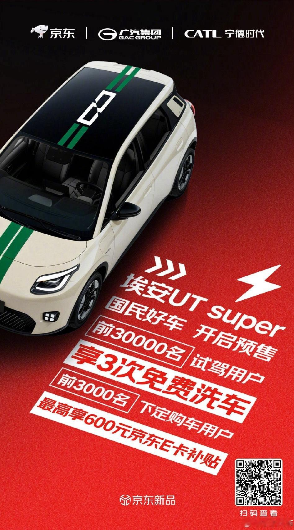 新车官方续航里程为500公里,换电时间为99秒,11月9日正式上市。预估埃安UT super的售价在10-12万元之间。 京东汽车正式命名为埃安utsuper京东造车