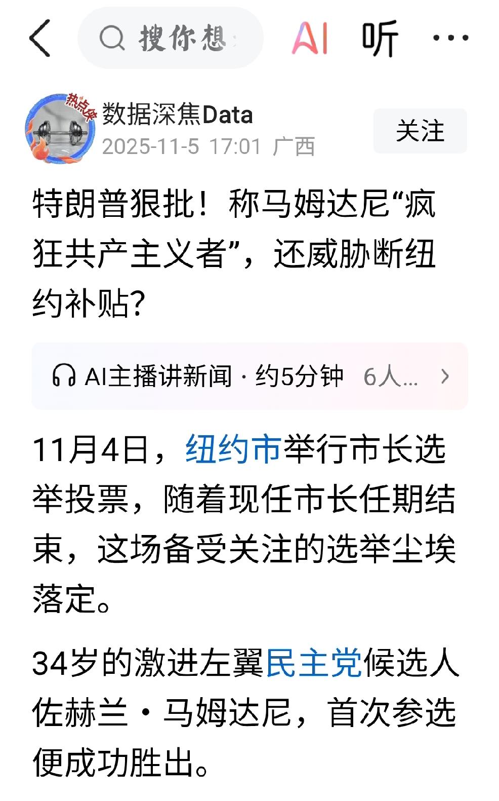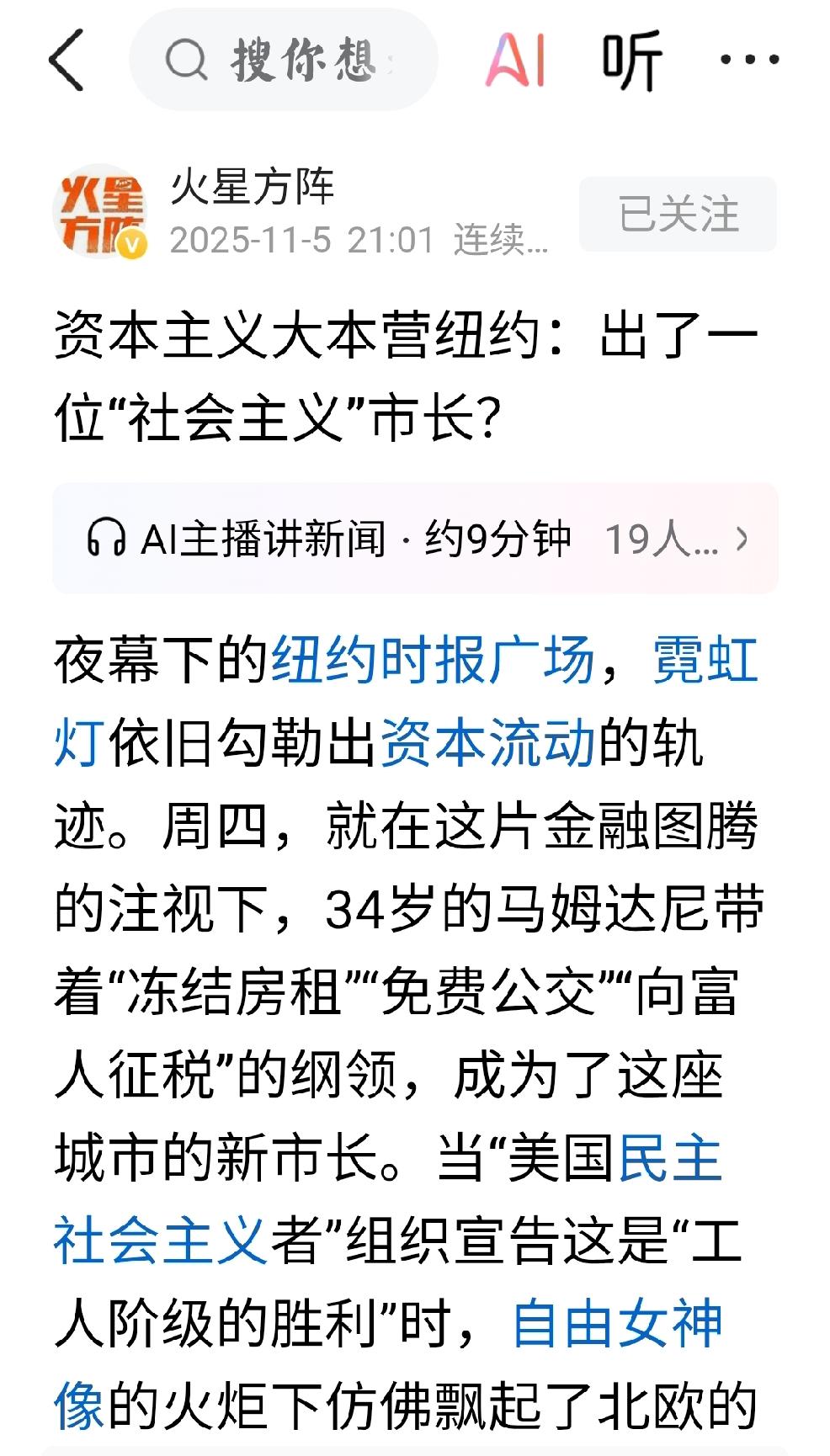 纽约的新市长 个人观点:任何的解读都代表着过去,过去只适合作为判断未来的基础,不能代表全部的未来。 关注当下,看清矛盾,这是美国内斗的新现象,这也标志着美国内斗进入了新阶段,共和党不能只手遮天,民主党重振旗鼓。美国内斗进入了缠斗时刻。 谁还理睬4000多万美国人的吃饭和看病问题? 美国政治选举,难得一见的真人秀,会给人带来爽感,为何不看? 个人认为坐山观虎斗,欣赏过程,结果是必然的,意料之中的内耗导致美国衰落。