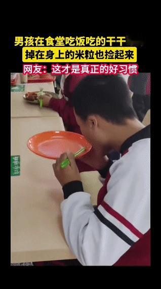 食堂里,男孩端着餐盘认真吃饭,不仅把盘子里的饭菜吃得干干净净,连不小心掉在衣服上的米粒也仔细捡起来吃掉。这一幕被记录下来,网友纷纷称赞这是真正的好习惯。食堂就餐 好习惯