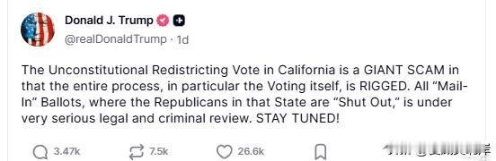川普称加州选区重划投票违宪。 “加州这次违宪的重新划分选区投票是一场巨大的骗局,整个过程——尤其是投票本身——都被操控了。所有“邮寄选票”都把共和党人“排除在外”,目前正接受非常严肃的法律和刑事审查。敬请期待后续!”