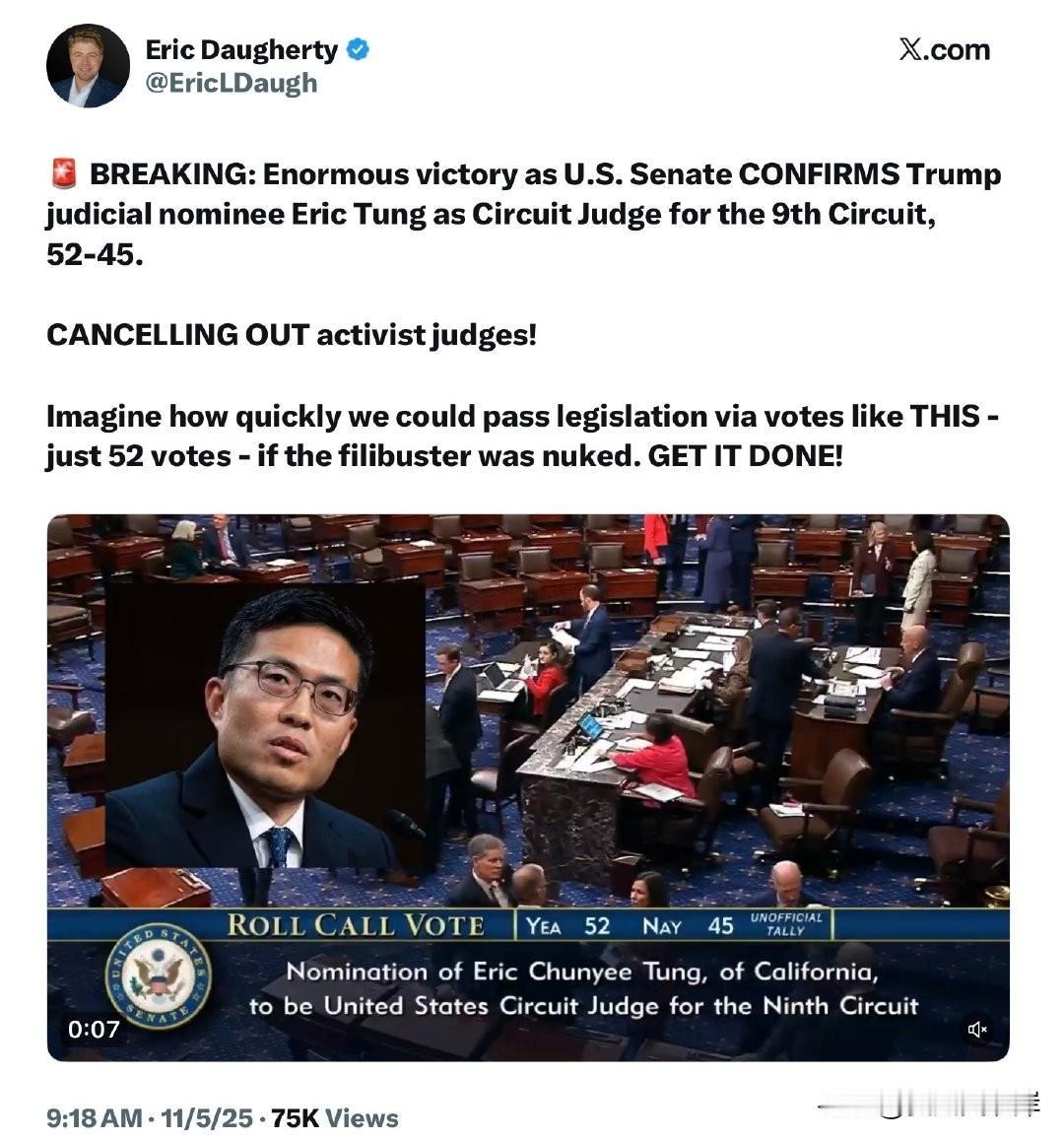 【突发】重大胜利:美国参议院确认特朗普司法提名人Eric Tung出任第九巡回法院法官! 投票结果:52票赞成,45票反对 清除激进法官! 想象一下,如果废除“阻挠议事”(filibuster),我们只需52票就能像这样迅速通过立法——赶紧行动吧!