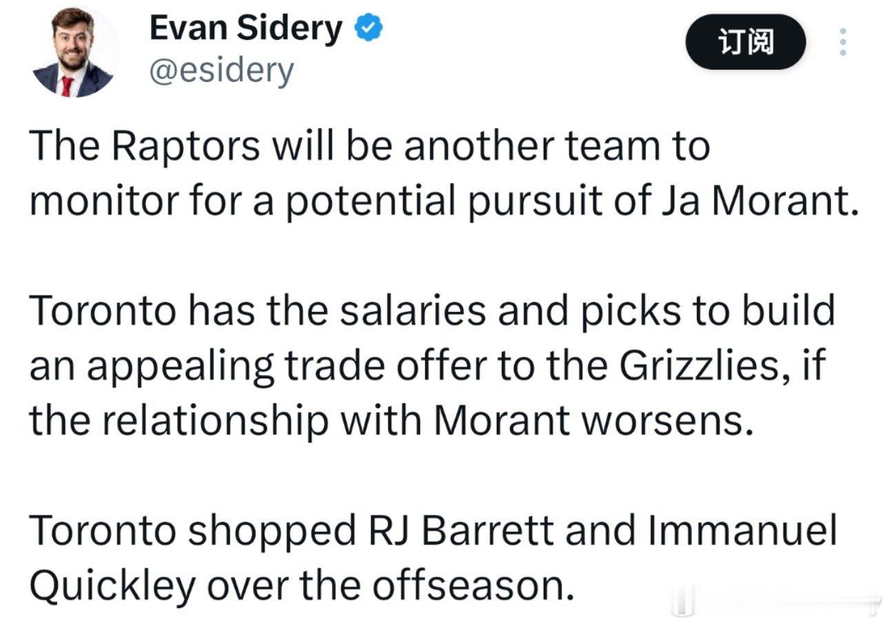 据Evan Sidery,猛龙队是除森林狼外,另一只可能追求莫兰特的球队。