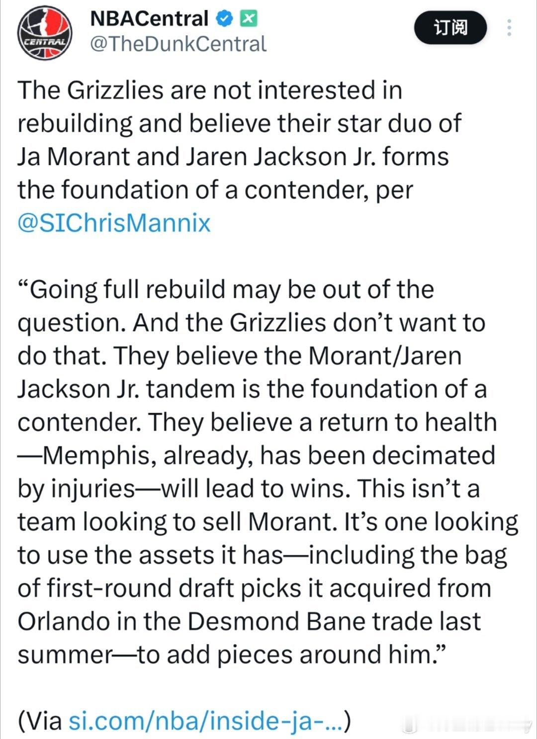 但据Chris Mannix,灰熊无意重建。他们仍相信莫兰特和JJJ是夺冠的基础,这支球队目前只是饱受伤病困扰。