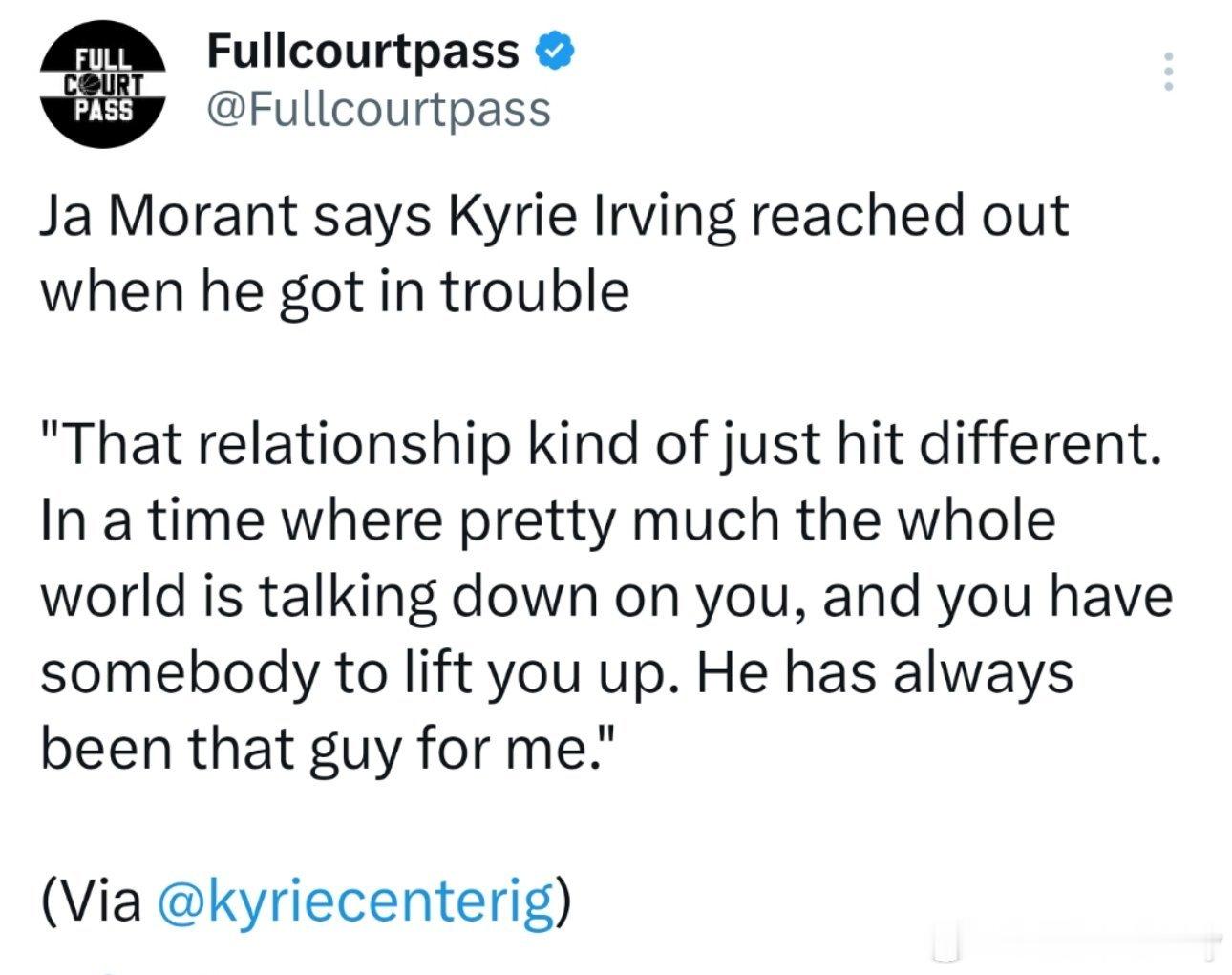 此外莫兰特本人表示,在他遇到麻烦时,欧文主动联系了他,并表示: