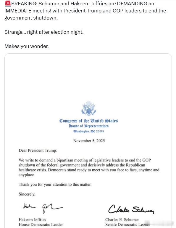 舒默和哈基姆·杰弗里斯正在要求与特朗普总统和共和党导岭人立即举行会议,以结束政府关门。