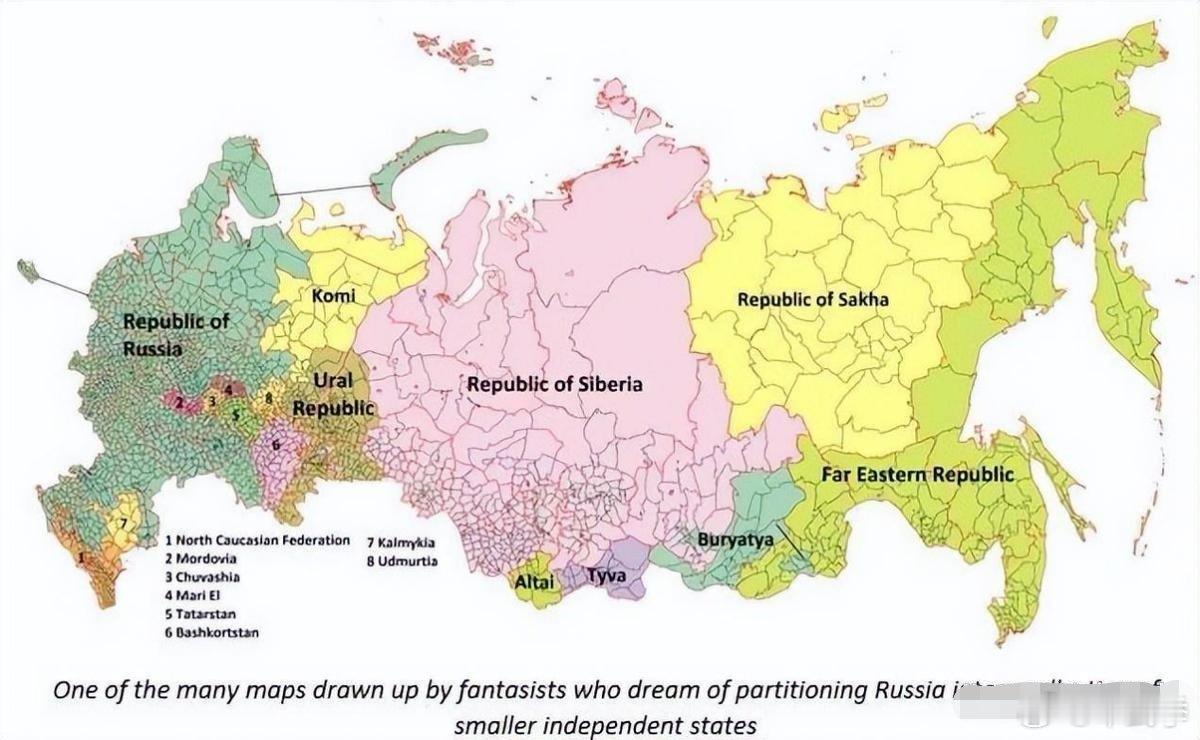 此前,乌克兰公开称计划将俄罗斯解体为6个国家,并计划拿走其中三个州。 西方甚至有政客提议,要挑动俄罗斯60个民族的不和与内乱,将其肢解成43个独立的共和国,主体的俄罗斯国家只剩下5000万人口,这就是让俄罗斯从世界地图上消失的“终极目标”。