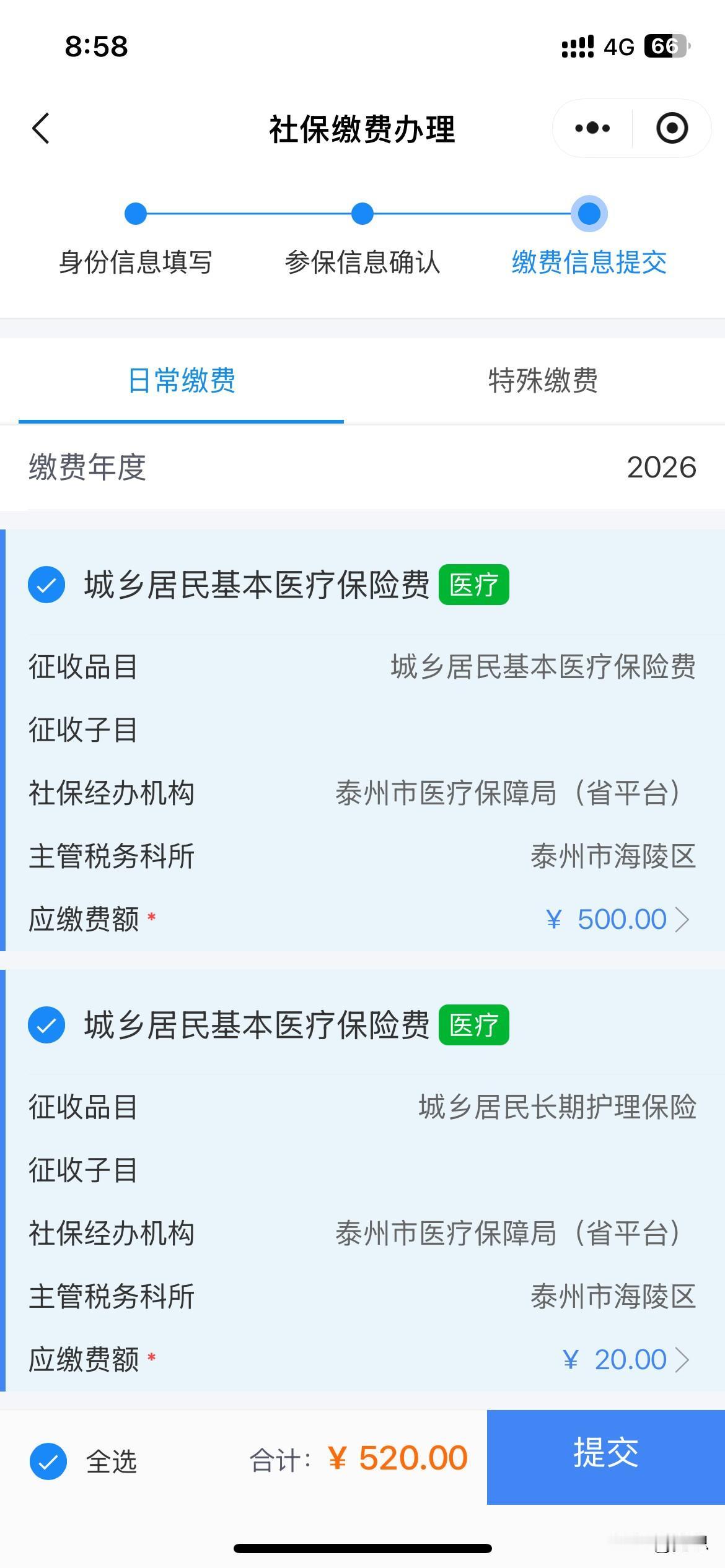 一年一度的农保交费又开始了,今天帮我妈上网去交费,一看2026年农保又涨了,年年涨啊,今年要交520元了。也有可能我妈年纪比较大了,交的费用比较高。不知道别的地方费用咋样?我这边坐标江苏泰州。