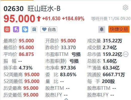 【港股异动丨旺山旺水首日上市高开184%】11月6日,旺山旺水-B今日首日在港挂牌上市,高开184.69%报95港元,市值159亿港元。该股IPO定价33.37港元,香港公开发售获6238.42倍认购,国际发售获16.87倍认购;所得款项净额5.2736亿港元。