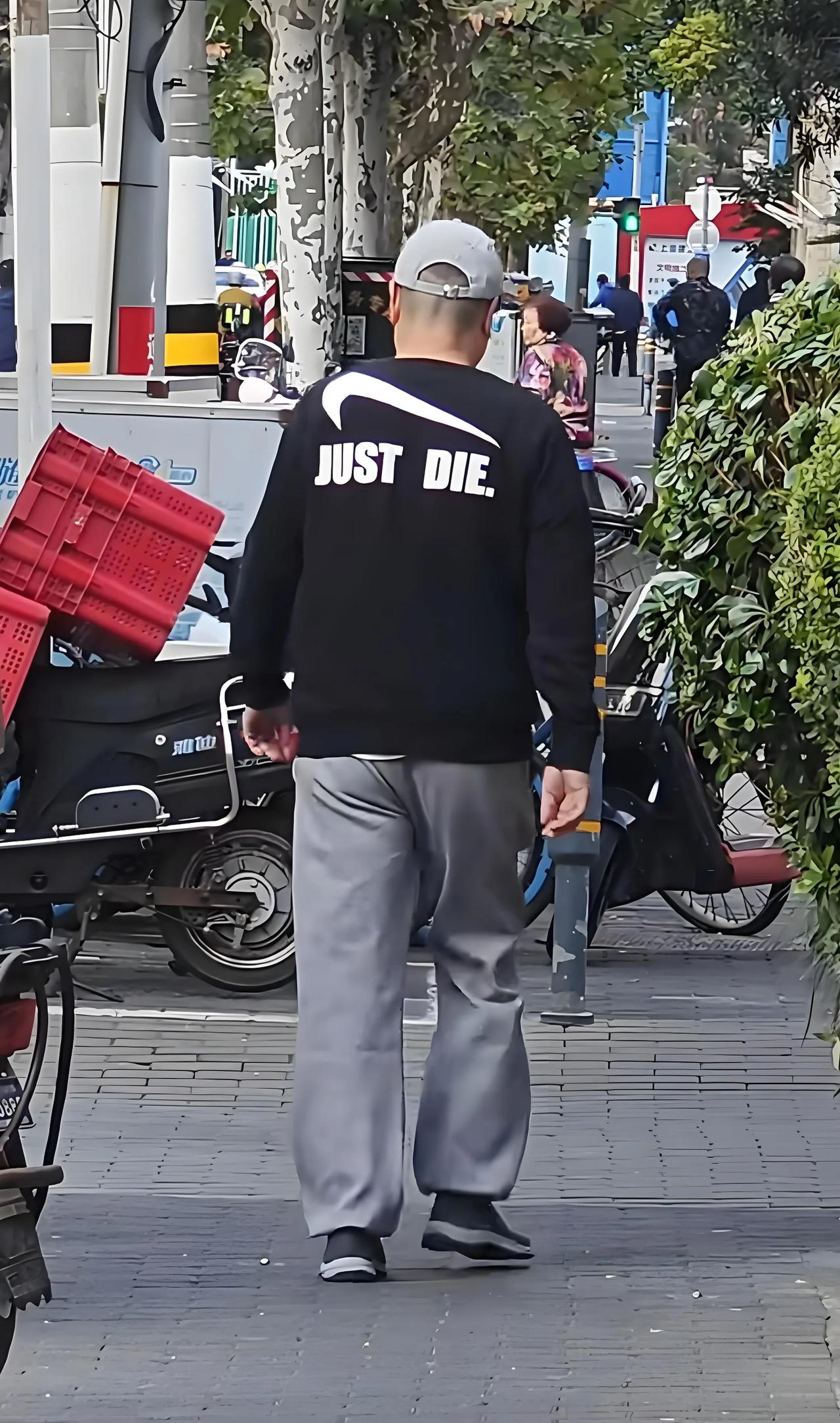 我想这大概是老的理想状态…… 虽已经白发苍苍,仍然身穿夹克,单肩背耐克包 脚穿t